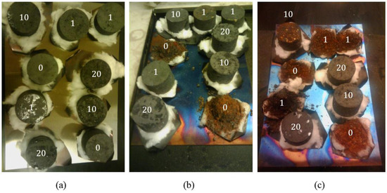 Figure 5 shows visual aspects of the samples at different reaction times. Figure 5a–c shows the fresh samples, after 24 h and after 6 days of reaction, respectively. It can be clearly seen that the two reference samples (untreated) are severely reacted after 24 h of exposure, exhibiting a mass loss of more than 86%. The entire samples are disintegrated in powder form, which would be considered as dust in a real smelting pot. The mass loss measurements were stopped when the samples disintegrated. For this reason, the gasification never reached 100% (Figure 2).