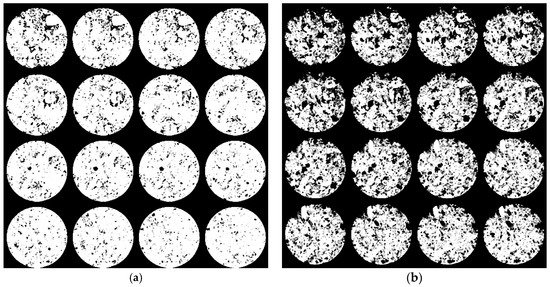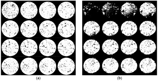 Figure 7a shows 16 images representing 16 equidistant scanned slices of an un-impregnated sample before the air reaction test, where the dark areas represent the pores. Scanning starts from the top of the sample (first image in the upper-left corner), and the bottom-right slice represents the bottom of the sample. Figure 7b shows the same sample after 6 h of exposure, representing 27% mass loss. The top of the sample burns faster than the middle because the fresh air was injected from the top of the furnace. The bottom of the sample did not react at the same rate as the top because the sample was placed on alumina wool in which the air was not freely circulated.
