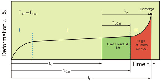 - The material’s residual life was determined based on abridged creep tests at a constant test stress corresponding to the operating one σb = σr = const and at a constant test temperature Tb for each test. The tests were performed using Instron single-sample machines (Norwood, MA, USA) with an accuracy of temperature during the test of ±1 °C.