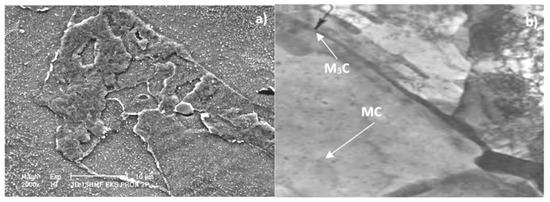The microstructure of 14MoV6-3 steel in the as-received condition is a mixture of bainite and ferrite, sometimes with a slight amount of pearlite. Moreover, very fine MC carbide precipitates that occur inside the ferrite grains are observed within the structure. In the bainite areas, there are small spheroidal cementite precipitates, while in the pearlite colonies, cementite lamellas exist. An example of the characteristic microstructure of 14MoV6-3 steel in the as-received condition is shown in Figure 2.