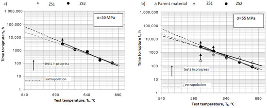 The results of creep tests for the examined repair welded joints marked ZS1 and ZS2 are summarised in Table 5 and presented in comparative graphs (Figure 6) as logtz = f(Tb) at σb = const, where tr is the time to rupture in the creep test.