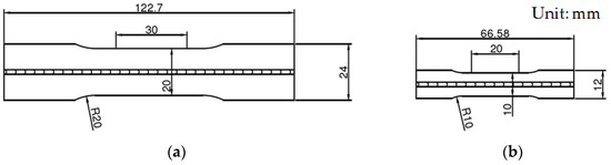 Sketches of the uniaxial tensile test samples with two different dimensions: (a) large size; and (b) small size.