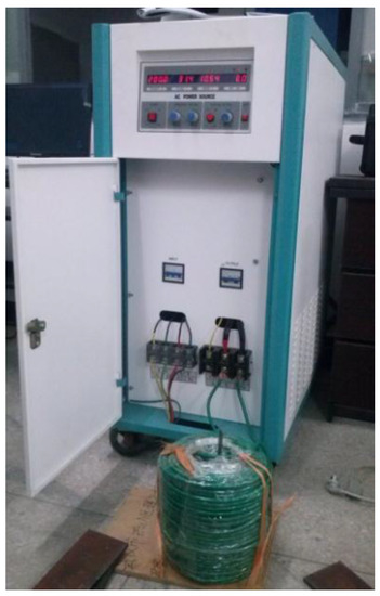 The magnetic device used here comprises a coil and an AC (Alternating Current) variable frequency power supply, as shown in Figure 2. The inner diameter and height of the coil are about 80 and 201 mm, respectively. The tensile samples were placed in the center of the coil vertically for magnetic treatment. The parameters of magnetic treatment were set as follows: the peak value of magnetic intensity was about 104 A/m, the frequency was 50 Hz and the processing time was 90 s. After the magnetic treatment, the mechanical properties of both the non-magnetic treated and magnetic treated samples were measured by a series of uniaxial tensile tests via a material testing machine (Mode: MTS810, MTS, Eden Prairie, MN, USA). All the strain rate used in this work was 0.01/s.