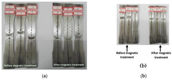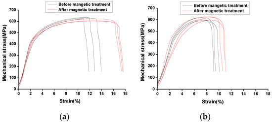 The broken tensile samples with and without magnetic treatment are shown in Figure 3 and the measured engineering stress–engineering strain curves are given in Figure 4.