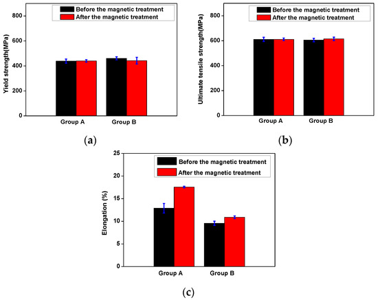 Mechanical properties before and after magnetic treatment: (a) yield strength; (b) ultimate tensile strength; and (c) elongation. Groups A and B represents the samples in large and small sizes, respectively. The blue line segments denote the standard deviation of measured data of three samples in each case.
