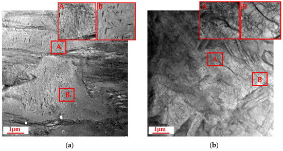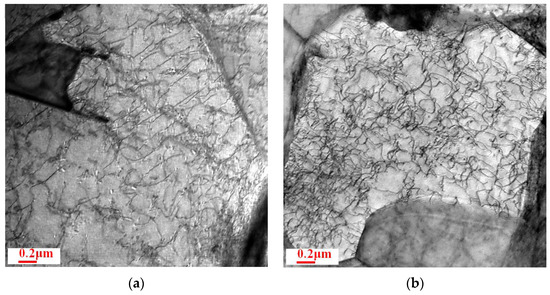 Figure 7a,b show the microstructures in the HAZ of the non-magnetically and magnetically treated TWBs, respectively. It can be seen that, similar to that of the weld zone, after the magnetic treatment, the dislocation density in the HAZ increased obviously and dislocation nets were formed in some local areas.