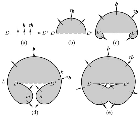 Frank-Read dislocation multiplication [22]: (a)–(e) the process of dislocation multiplication. In the figure, b is the Burgers vector and τ is the component of stress applied on the dislocation line DD′ under a magnetic field.