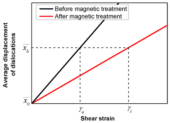 Considering the plastic deformation at a certain moment of the uniaxial tensile test, the average displacements of dislocations at the beginning and end of the deformation are supposed to be and , respectively. According to Equation (10), different dislocation density values bring different line slopes and shear strains in Figure 11. Therefore, a higher dislocation density causes a smaller slope and thus a larger shear strain, i.e., . Since the dislocation density of the magnetically treated TWBs is much higher than that of non-magnetically treated ones according to the results of TEM, the former has a much larger strain for a certain average displacement of dislocations. The displacement, in the plastic deformation process, is continuous from the beginning to the fracture of the TWB. Namely, the process of the dislocation slip is continuous. Therefore, it can be concluded that the magnetically treated TWBs have a higher elongation.