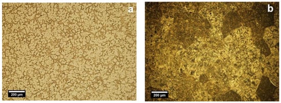 The grain sizes of both phases of the alloy were also calculated based on XRD peak broadening using the Debye–Scherrer formula [] as: for α phase: 15.5 nm in cast alloy and 15.7 nm in annealed alloy; and for β phase: 47.6 nm in cast alloy and 15.3 nm in annealed alloy. These values were determined and averaged based peak broadening located at 40.9°, 63.5°, and 55.6°, 109.1° for α and β phases, respectively.