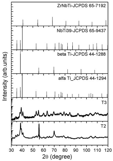 The phase composition of T1, T2, and T3 alloys was investigated by X-ray diffraction (Figure 2). The T1 alloy is characterized by the presence of α + β phases []. The XRD results for T2 and T3 samples revealed the existence of α and β phases. The β phase intensities in T2 alloy are significantly higher compared to α phase. In the literature, it was demonstrated that Nb is responsible for the β phase stabilization in titanium alloys [,,,] while Liu et al. demonstrated that addition of Zr in the Ti-Nb system has no influence on the formation of α and β phases [,]. All diffraction peaks positions were in agreement with the ones reported in the literature for the Ti-Nb-Zr system of different atomic concentrations (Ti4Nb4Zr, Ti22Nb6Zr, Ti36Nb5Zr) [,,]. The identified α and β phases through XRD are consistent with the obtained optical images (Figure 1).