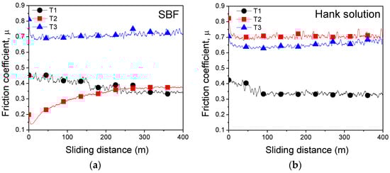 Evolution of the friction coefficients for T1, T2, and T3 alloys vs. sliding distance in (a) simulated body fluid (SBF) and (b) Hank solution.