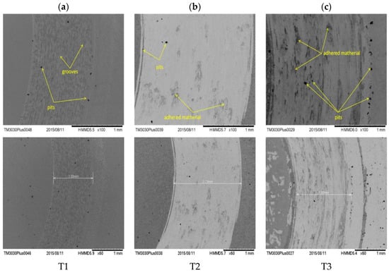 SEM images of the wear track after the tribological test in Hank solution of the investigated alloys are presented in Figure 6a–c. For all alloys the images taken at lower magnification evidenced the differences between the worn surfaces of the samples. Note that T1 alloy was much less affected by the wear in Hank solution, results being in good agreement with friction coefficient and wear rate values. After the tribological tests, on the T2 (Figure 6b) and T3 (Figure 6c) surfaces, the presence of the adhered material was found as oxidized material due to immersion in the corrosive solution. These results are also sustained by friction coefficient results. In Hank solution, the oscillations in friction coefficient of T2 surface are more pronounced than those of T3 sample, indicating that the formation and removal of wear debris are more pronounced on this material. On all the alloys, pits appeared, suggesting a decrease of the wear resistance. On T3 surface (Figure 6c), more oxidized areas were observed compared to T1 (Figure 6a) and T2 (Figure 6b) alloys. This behavior could indicate an increase friction coefficient value of the T3 alloy in the corrosion environment [].