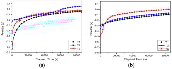 Independent of the electrolyte, both cast and annealed Ti25Nb10Zr alloys showed values of open circuit potential that were more electropositive than the Ti6Al4V alloy (Figure 7). In Hank solution, all investigated alloys exhibited stable open circuit potentials after 5 h of immersion (Figure 7b). In the case of T3 sample immersed in SBF, one may observe some fluctuation of open circuit potentials, indicating the formation/destruction of oxide layer formed during the immersion in electrolyte (Figure 7a). In SBF solution, cast alloy (T2) showed the noblest open circuit potential (55.4 mV). In Hank electrolyte, the most electropositive value of open circuit potential was found for T3 alloy (−0.7 mV).
