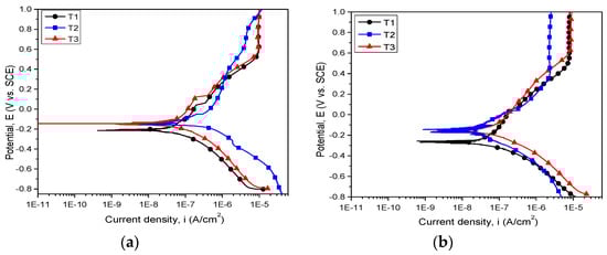 Comparing the aspect of the potentiodynamic curves, it is obvious that for all the investigated alloys the passivation process takes place. The passivation domain started from 403 mV for T2, from 531 mV for T1, and from 632 mV for T3, T2 being the first surface which starts to passivate (Figure 8b). In SBF solution, a clear passivation domain is observed in the case of T1 and T3, while T2 started to passivate approximately 150 mV earlier (Figure 8a).