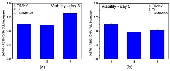 - Cell viability and proliferation assay after five days showed that the Ti25Nb10Zr alloy exhibited good viability and proliferation with values of approximately 10% higher, respectively, than the ones registered for pure Ti.