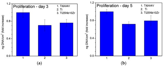 For a better comparison of the biological properties of Ti25Nb10Zr alloy, the most used metals in implant manufacturing were chosen: pure Ti (cpTi) and Ti6Al4V alloy (Grade 5 ELI). The viability of cultured osteoblasts on the pure Ti, Ti6Al4V and the new alloy is shown in Figure 9a,b at 3- and 5-days, respectively, as measured by the MTT assay. After 3-days the viability of cells grown on Ti25Nb10Zr (Figure 9a) is higher than that recorded for the other two samples (pure Ti and Ti6Al4V) and on day 5 the level remains comparable to that recorded for pure Ti sample (Figure 9b).