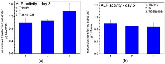 In the literature, there are several studies which revealed that the rougher surface promoted osteoblast differentiation, increased bone-to-implant contact in vivo and improved clinical rates of wound healing [,]. Gittens et al. showed that the nanoscaled surface roughness could be more proper for osteoblast differentiation and tissue regeneration, because the size of proteins and cell membrane receptors are nanometric []. Some scientists explained that a high osteoblast proliferation on nanoscale rougher surfaces could be explained by the increase in alkaline phosphatase (ALP) synthesis and higher immunostaining of osteocalcin and osteonectin [,]. Our experimental results showed that osteonectin and osteocalcin gene expression of MG63 cells grown after 5 days on Ti25Nb10Zr alloy is higher compared with Ti6Al4V and pure Ti surfaces. An increase in alkaline phosphatase was also observed for Ti25Nb10Zr alloy. Thus, Ti25Nb10Zr alloy can be a possible candidate for replacing the pure Ti and Ti6Al4V alloy in biomedical applications.