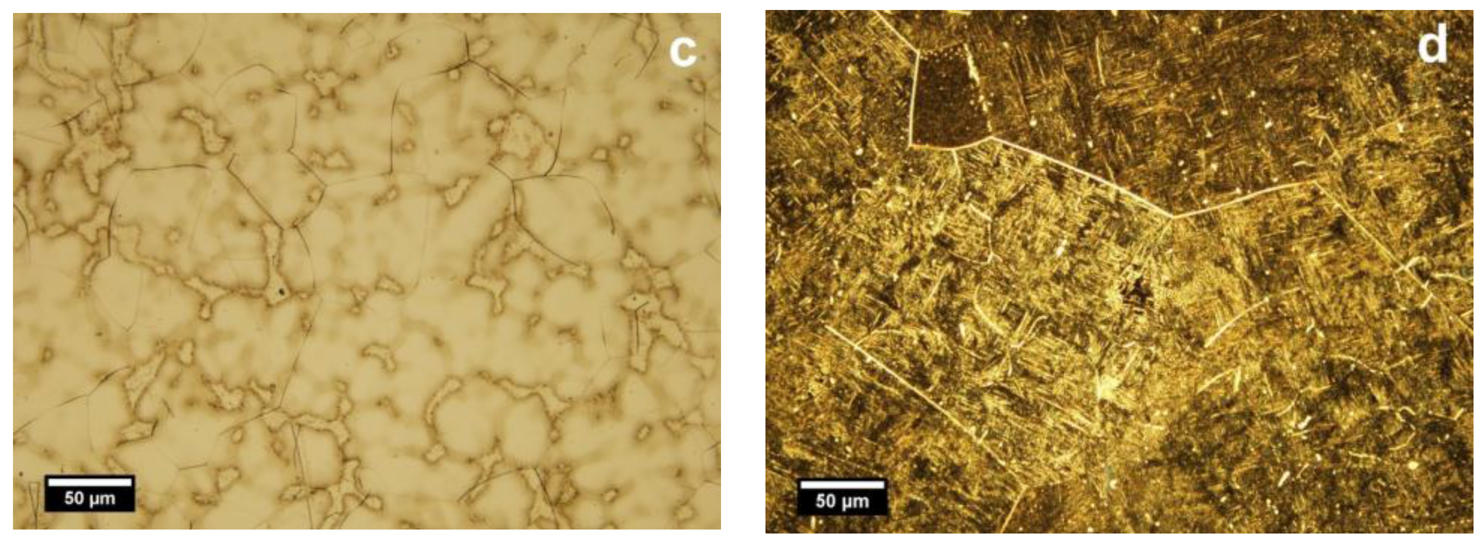 The EDS elemental composition of the T2 alloy was 25 ± 1.2 wt % Nb, 10 ± 0.9 wt % Zr and rest Ti. For T2 alloy, the metallographic investigations showed typically biphasic microstructures consisting of α (light) and β (dark) phases, where polyhedral grains of α and β phases at the boundaries can be distinguished (Figure 1a,c). The average of β grains is 55.1 µm (±15 µm). Figure 1a showed that the microstructure of cast Ti25Nb10Zr (T2) is majorly formed of α phase and a dispersion of β phase. After annealing, enlarged dark grains appear delimited by a light network (Figure 1b). At higher magnifications (Figure 1d), inside the delimited area, an acicular microstructure assigned to martensite with the needles oriented in the same direction was observed. Thus, because of the annealing in the β domain and cooling in the air, the diffusion processes take place on grain boundaries where the separating network corresponds to α phase. Although inside the grain, the diffusion coefficients are smaller, and the β phase transformation was conducted by martensitic mechanism.