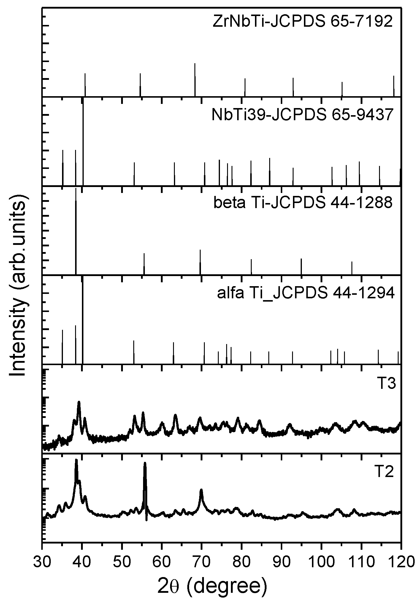 X-ray diffraction patterns of cast (T2) and annealed (T3) TiNbZr alloy.