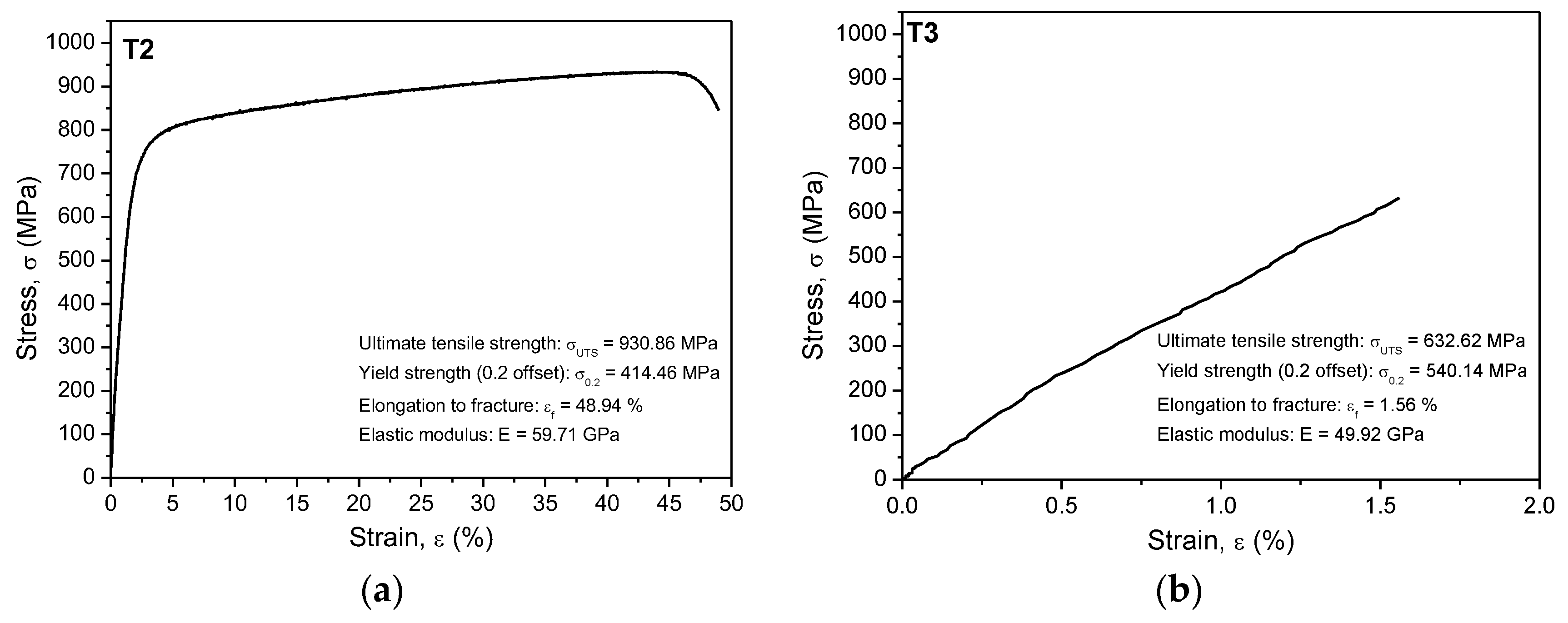 Stress-strain curves for (a) TiNbZr cast (T2) and (b) annealed (T3) alloys; the presented results are only for one of replicate.