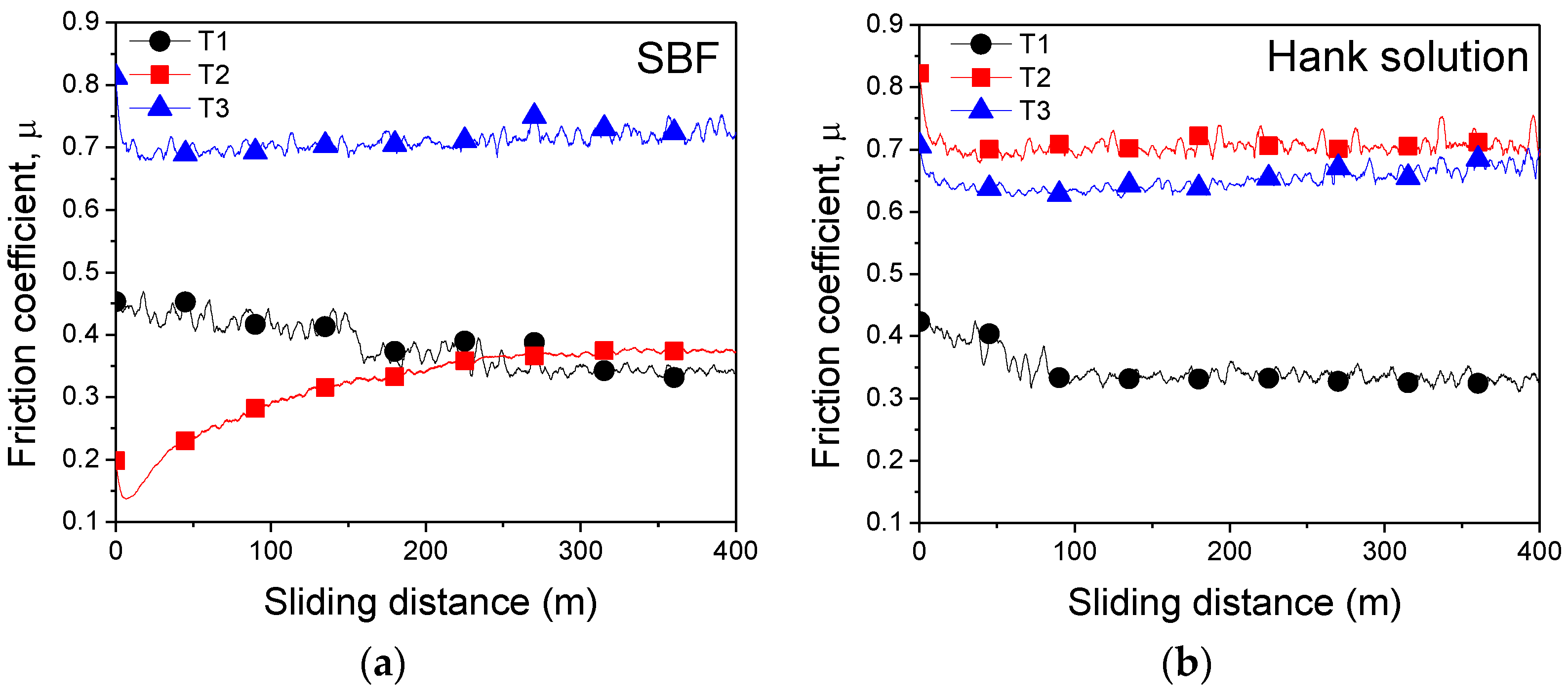 Evolution of the friction coefficients for T1, T2, and T3 alloys vs. sliding distance in (a) simulated body fluid (SBF) and (b) Hank solution.