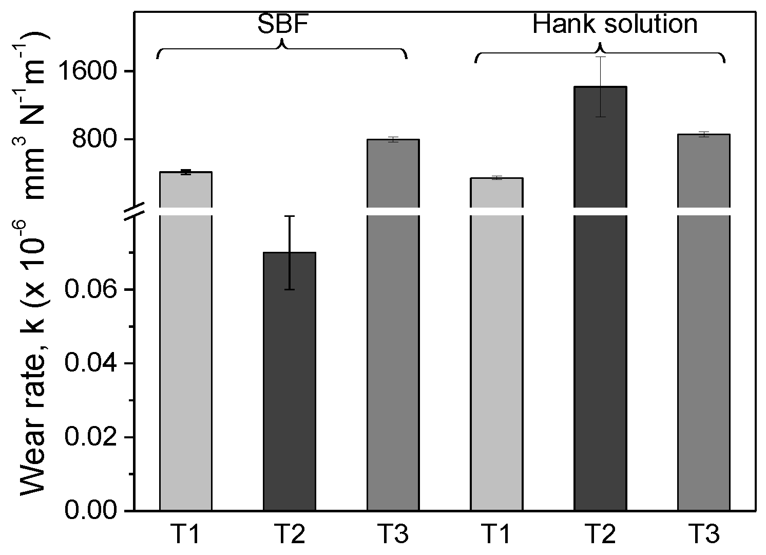 Mean value of wear rate for T1, T2, and T3 alloys, calculated in four areas on each sample.