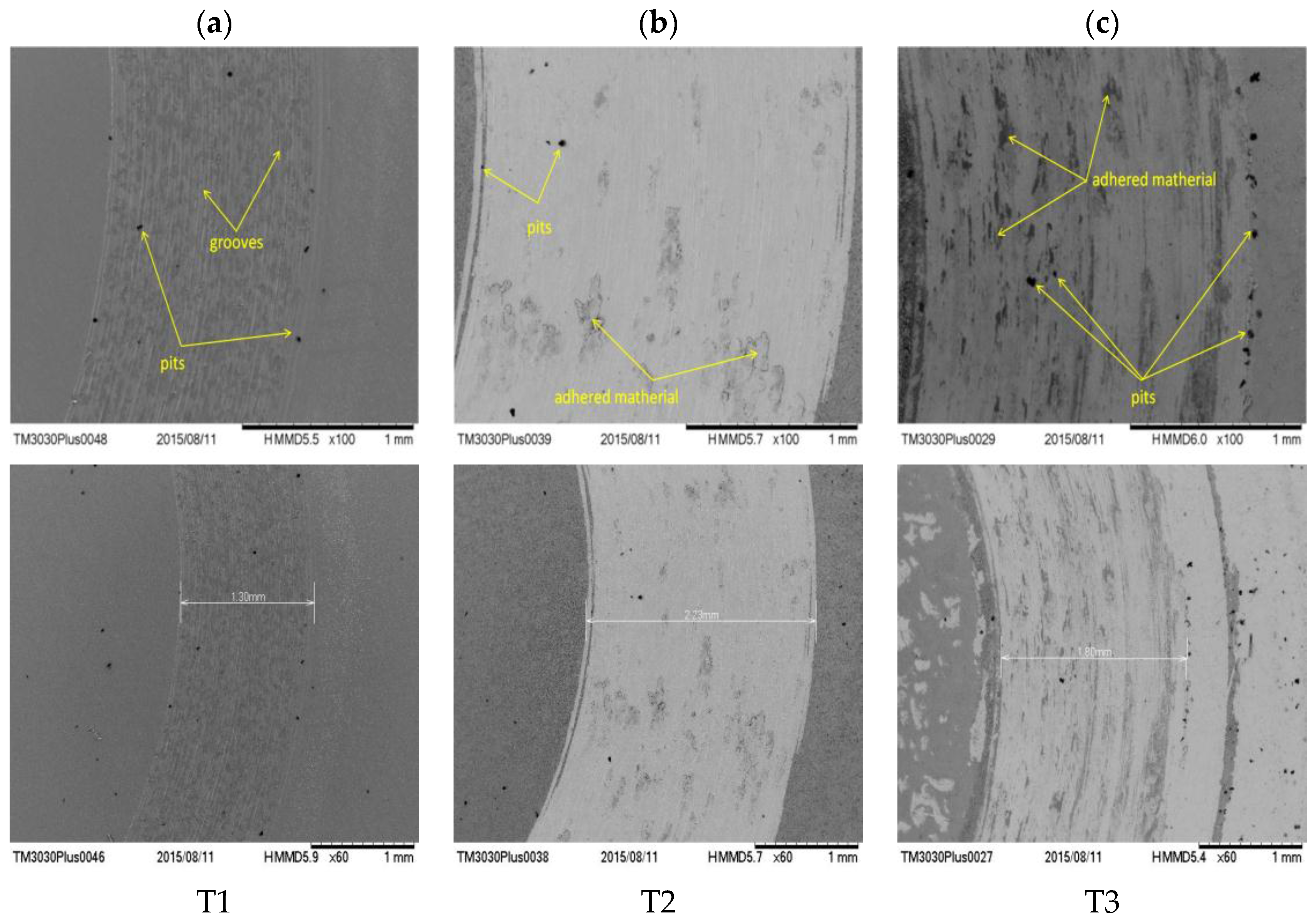 Scanning electron microscopy (SEM) micrographs of the wear tracks for the T1 (a), T2 (b), and T3 (c) alloys after the tribological tests in Hank solution.
