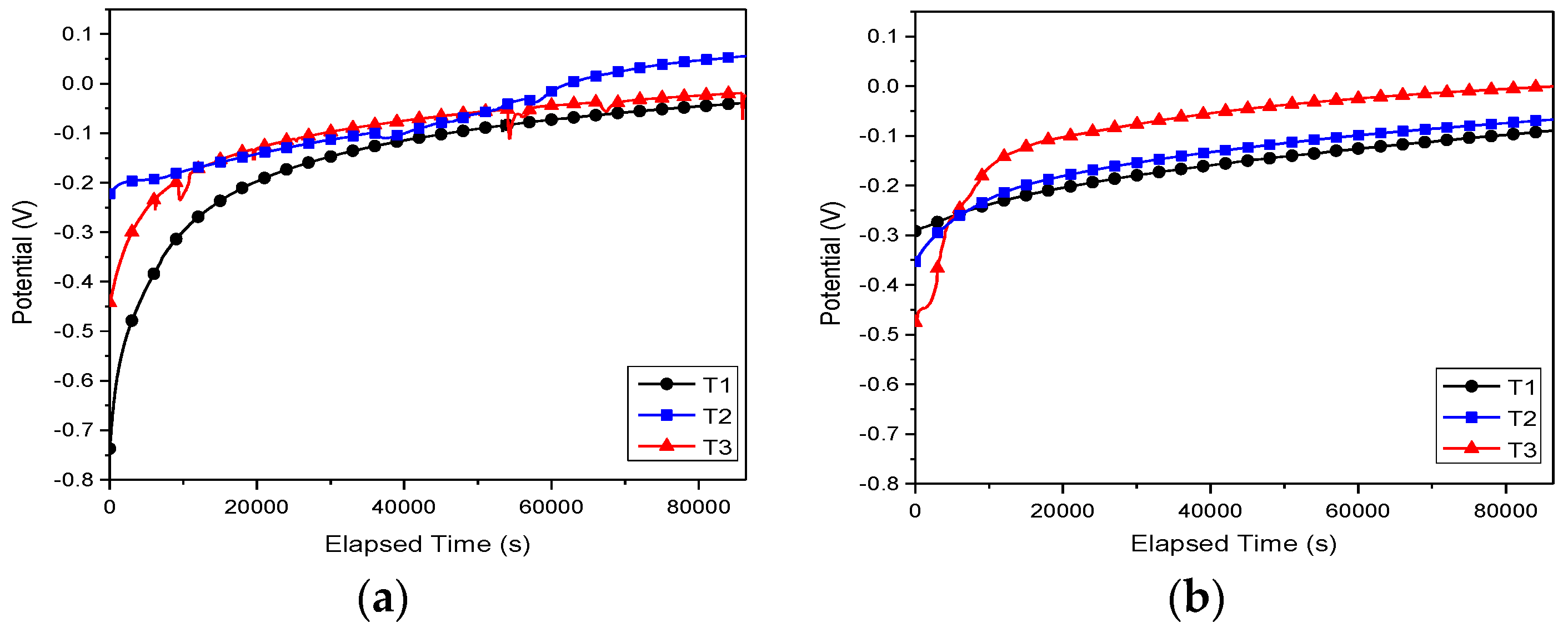 Independent of the electrolyte, both cast and annealed Ti25Nb10Zr alloys showed values of open circuit potential that were more electropositive than the Ti6Al4V alloy (Figure 7). In Hank solution, all investigated alloys exhibited stable open circuit potentials after 5 h of immersion (Figure 7b). In the case of T3 sample immersed in SBF, one may observe some fluctuation of open circuit potentials, indicating the formation/destruction of oxide layer formed during the immersion in electrolyte (Figure 7a). In SBF solution, cast alloy (T2) showed the noblest open circuit potential (55.4 mV). In Hank electrolyte, the most electropositive value of open circuit potential was found for T3 alloy (−0.7 mV).