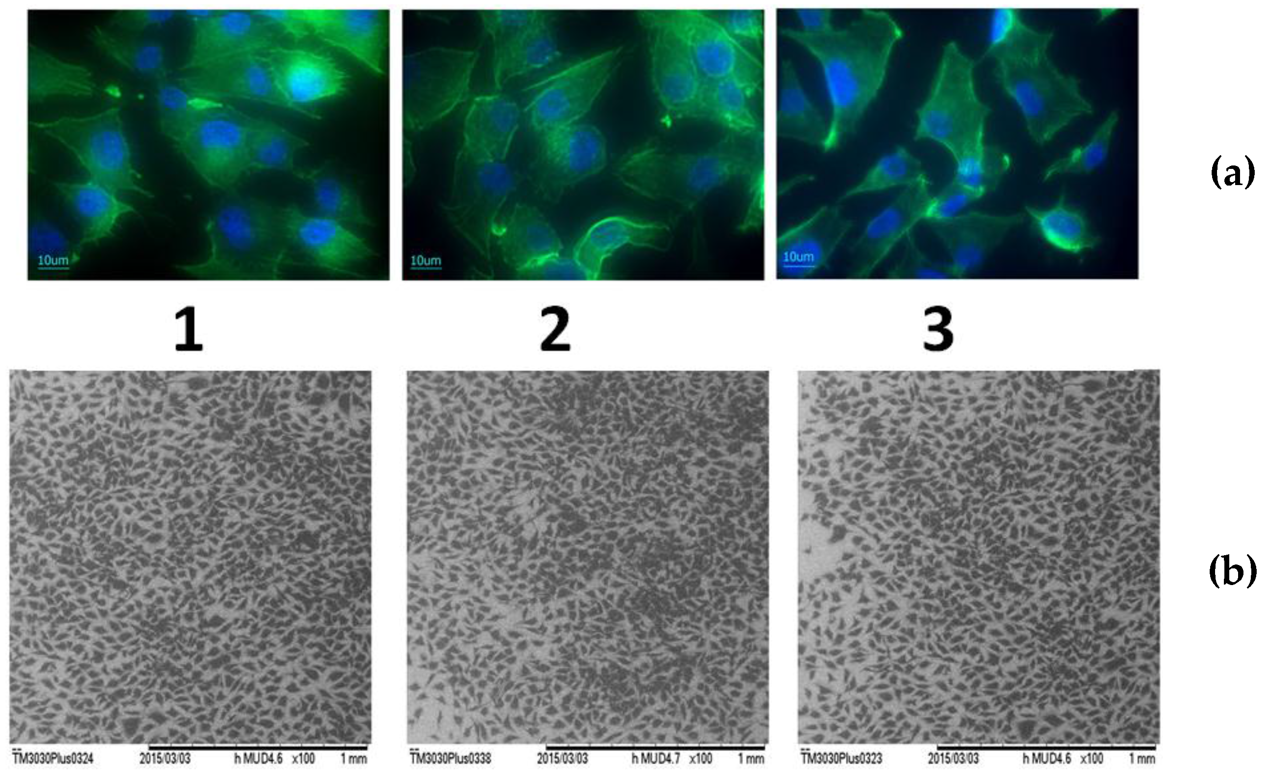 The morphology and attachment uniformity of the cells to the sample surface were examined by fluorescence microscopy and scanning electron microscopy. For fluorescence microscopy, cells were first fixed with PFA (paraformaldehyde) 4% in PBS (Phosphate Buffer Solution) and then treated with fluorescein isothiocyanate (FITC)-labeled Phalloidin (1 μg/mL) and Hoechst 33258 (10 μg/mL) for highlighting actin filaments and the nucleus. After each step two PBS washes were made. Cell examination was performed using a Zeiss Axio Observer microscope (Zeiss, Jena, Germany) equipped with AxioCam MRc 5 camera (Zeiss, Jena, Germany). For scanning electron microscopy, the cultured cells were fixed with 2.5% glutaraldehyde in sodium cacodylate buffer + subsequent metallization treatment. The data resulted from all of the in vitro biological tests were statistically analyzed by paired Student’s t-test (α = 0.005, as significant level of confidence).