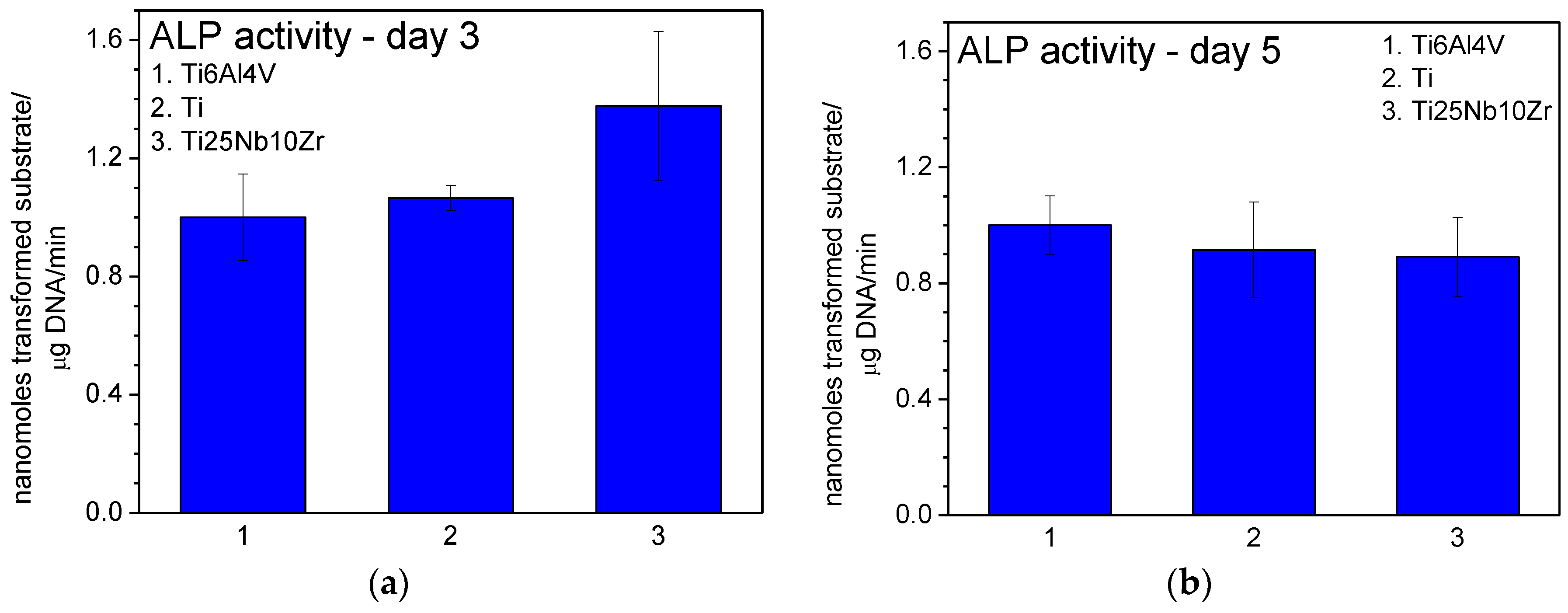 Actin labelling in osteoblast cells has shown a cytoskeleton composed of intracellular filaments (stress fibers) with parallel orientation in cells grown on alloys and pure Ti surface (Figure 10a). It can be observed that some of the stress fibers crossed the totality of the cells and some of them ended in a focal contact. SEM analysis of MG 63 cells grown on pure Ti and Ti alloys showed that, in all cases, the cells were uniformly spread and presented a flattened polygonal morphology (Figure 10b). The average results of cell proliferation tests are represented in Figure 11. On day 3 (Figure 11a) and day 5 (Figure 11b), the cell proliferation level recorded for Ti25Nb10Zr sample is comparable to that of pure Ti sample and slightly lower than the one recorded for Ti6Al4V. On day 5 alkaline phosphatase activity (ALP) (Figure 12b), is similar to that of the other two samples, though on day 3 it is slightly higher (Figure 12a).