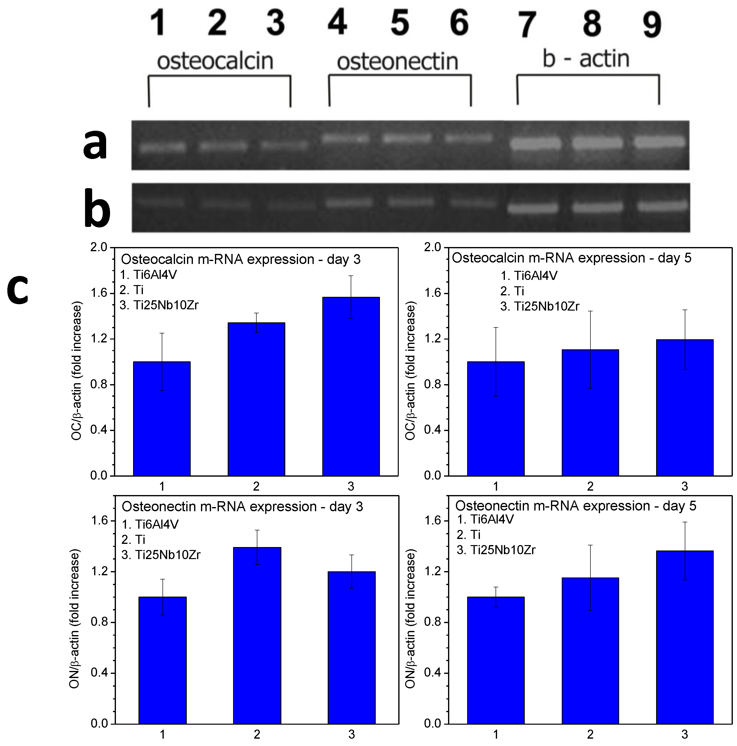 - Osteocalcin and osteonectin gene expression of MG63 cells grown after three days on Ti25Nb10Zr surface is comparable to that recorded for pure Ti and higher than of Ti6Al4V alloy. After five days of culture, the osteocalcin expression level of Ti25Nb10Zr alloy is comparable to that recorded for the pure Ti and Ti6Al4V alloy, while the osteonectin expression level is slightly higher than both of them.