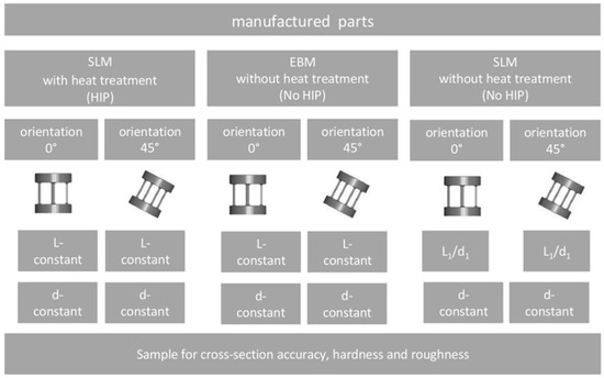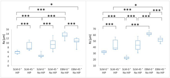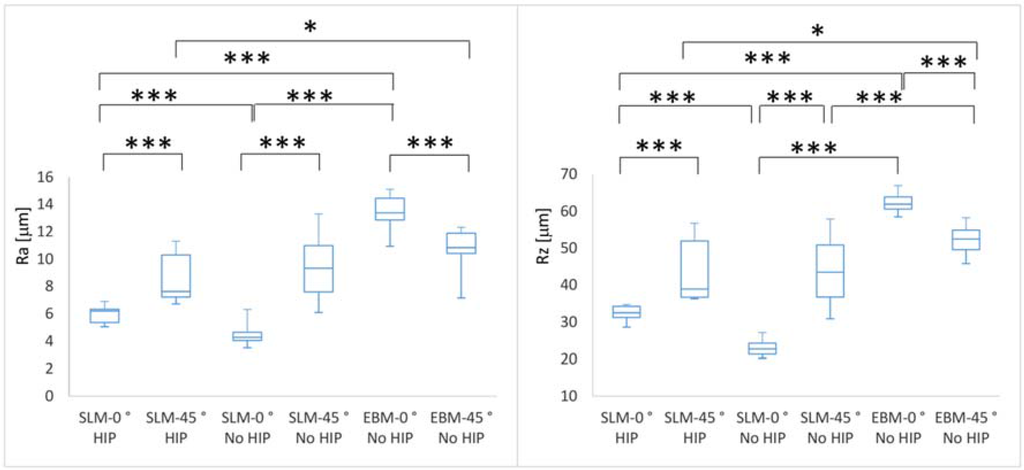 - The values of roughness obtained for SLM- and EBM-manufactured Ti6Al4V parts correspond to those from the literature. The SLM parts have significantly lower Ra and RZ values in both orientations.