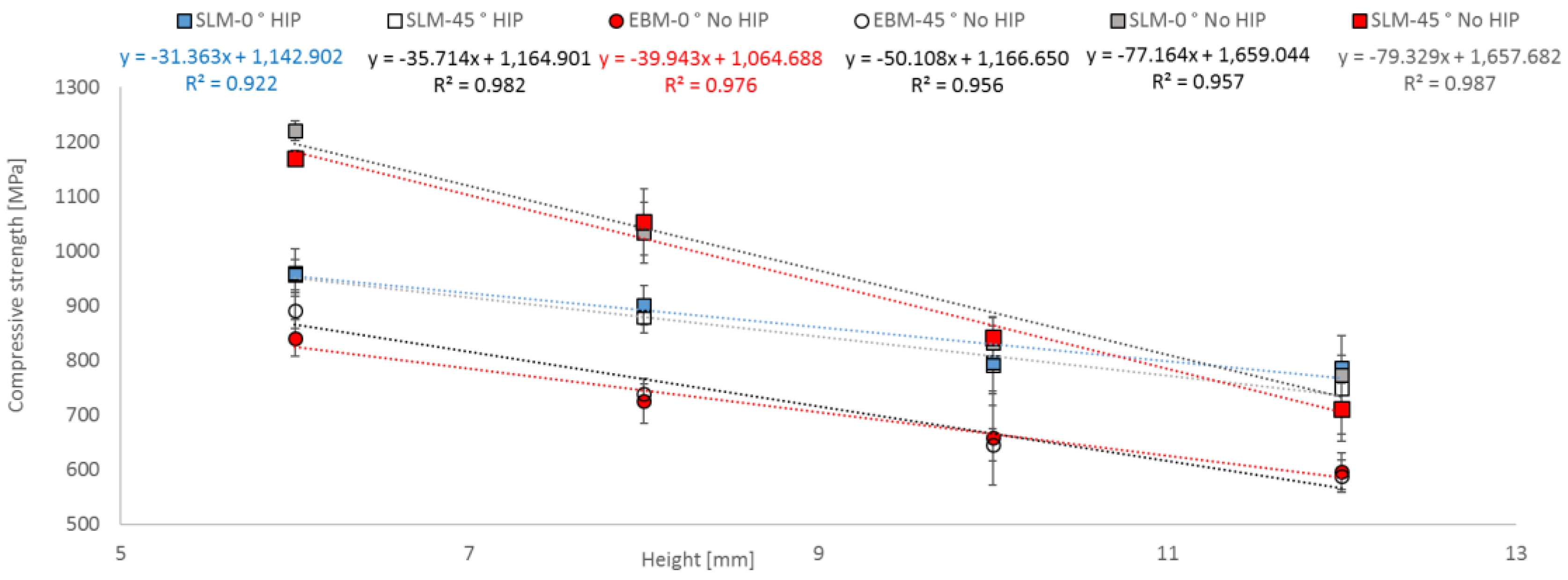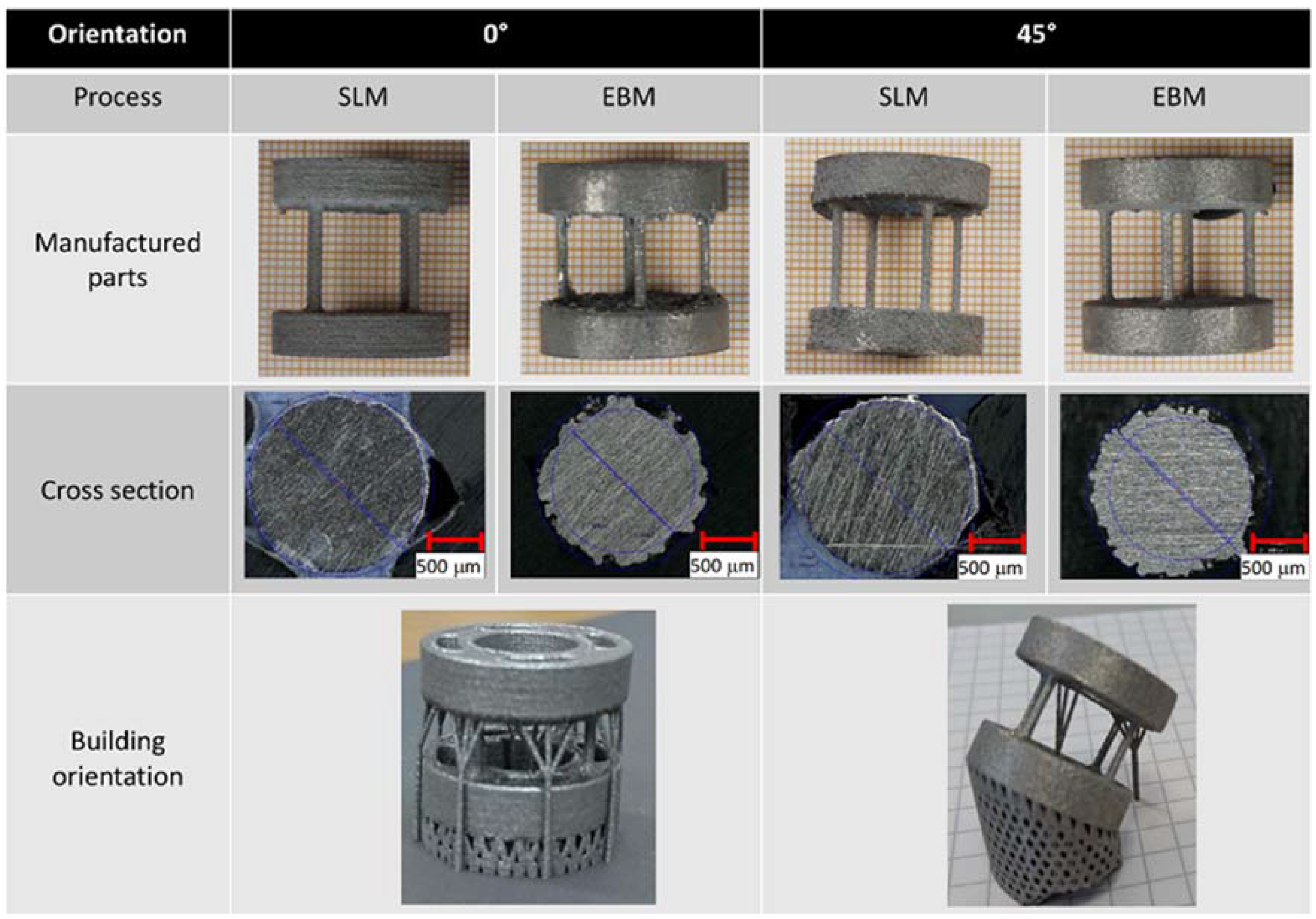 - A strut orientation of 45 degrees leads to a moderate decrease in the compression strength of EBM and SLM parts.