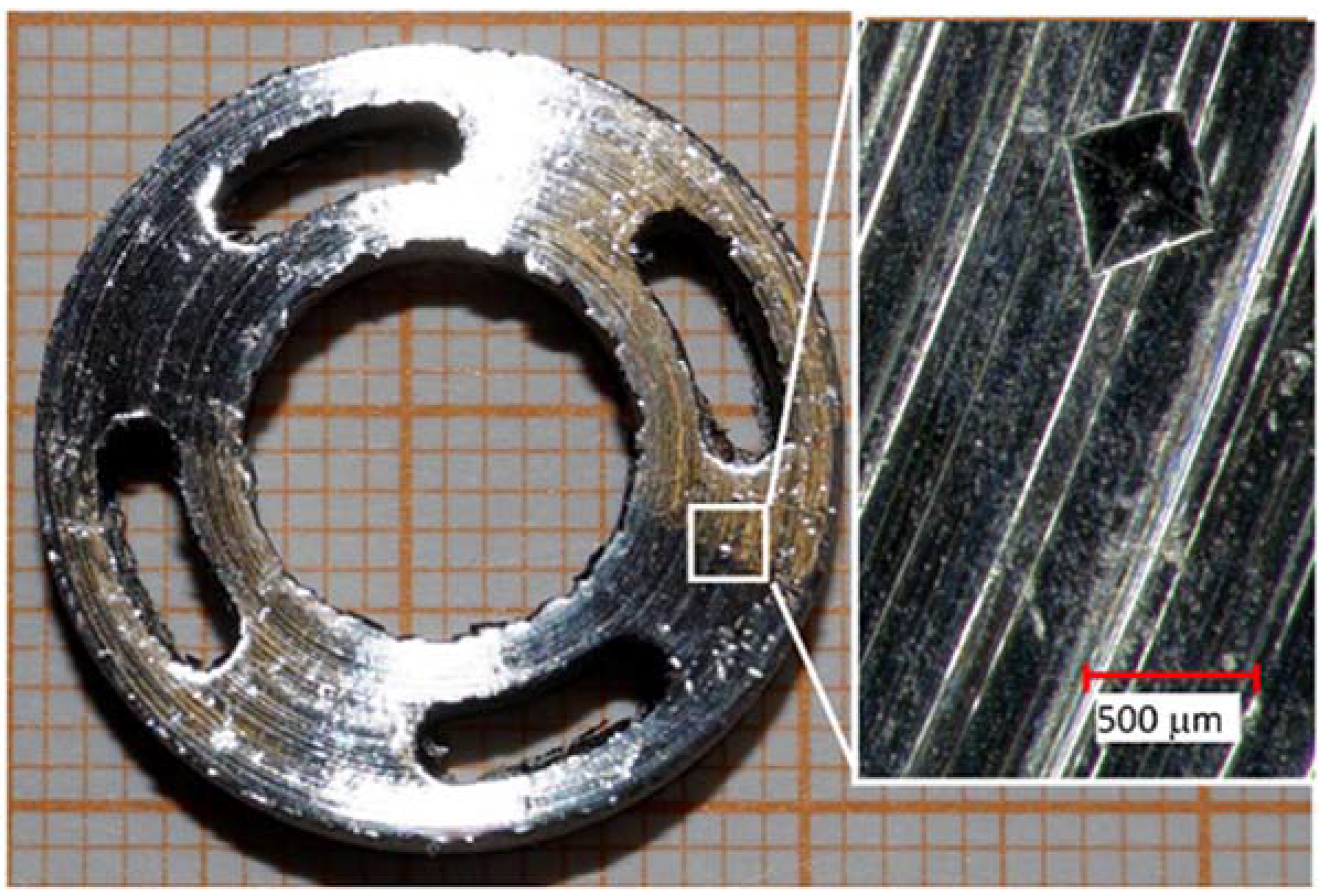- Weißmann, V.; Bader, R.; Hansmann, H.; Laufer, N. Influence of the structural orientation on the mechanical properties of selective laser melted Ti6Al4V open-porous scaffolds. Mater. Des. 2016, 95, 188–197. [Google Scholar] [CrossRef]