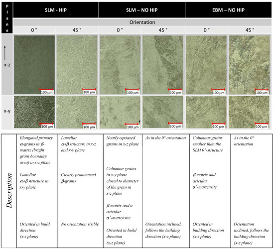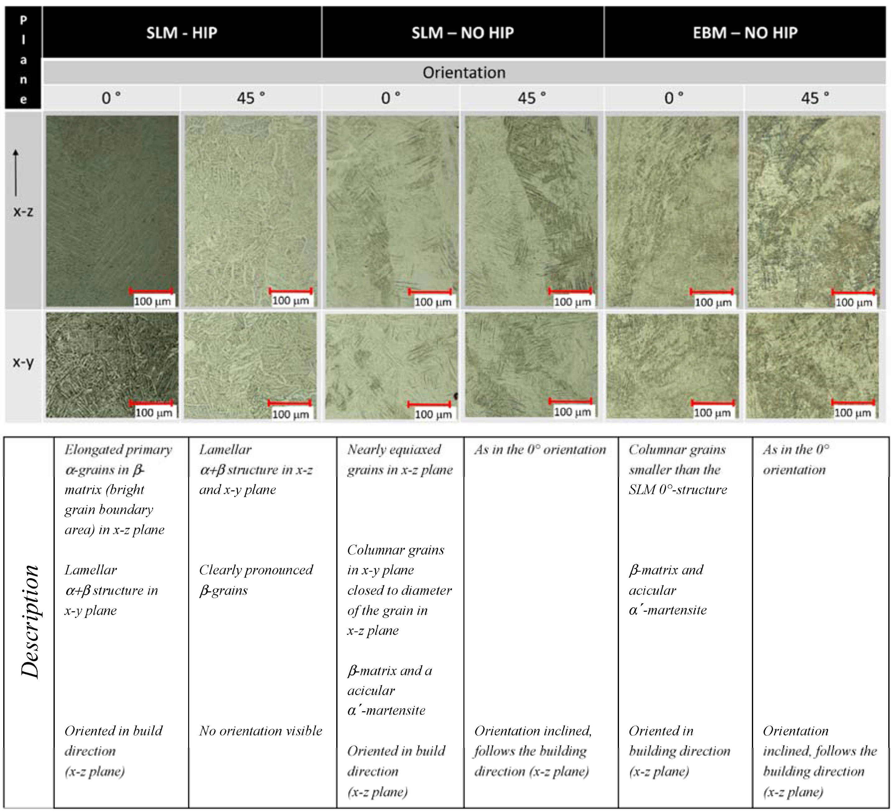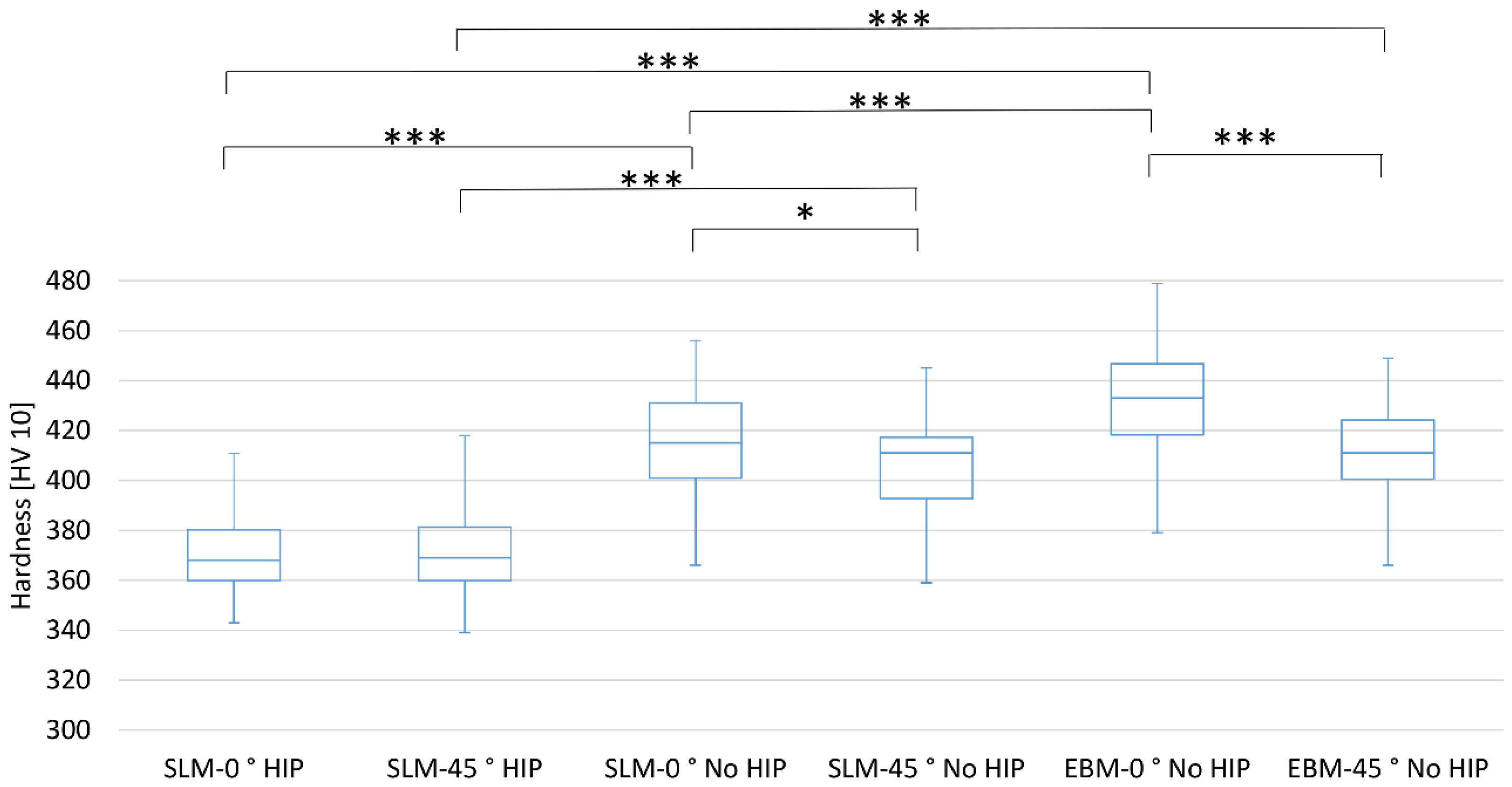- Different hardness values between EBM and SLM were determined and supported by their different respective microstructures. The No HIPed EBM parts showed the highest values for hardness. The HIPed SLM parts showed the lowest values according to microstructure. The hardness of the 45° oriented parts without heat treatment was significantly lower than of the 0° oriented parts. Heat-treated parts showed no differences in dependence on the orientation.