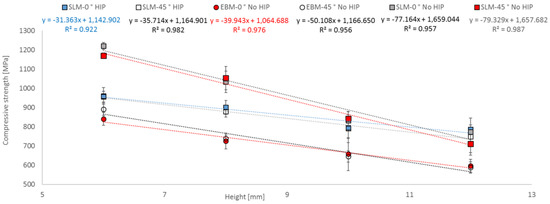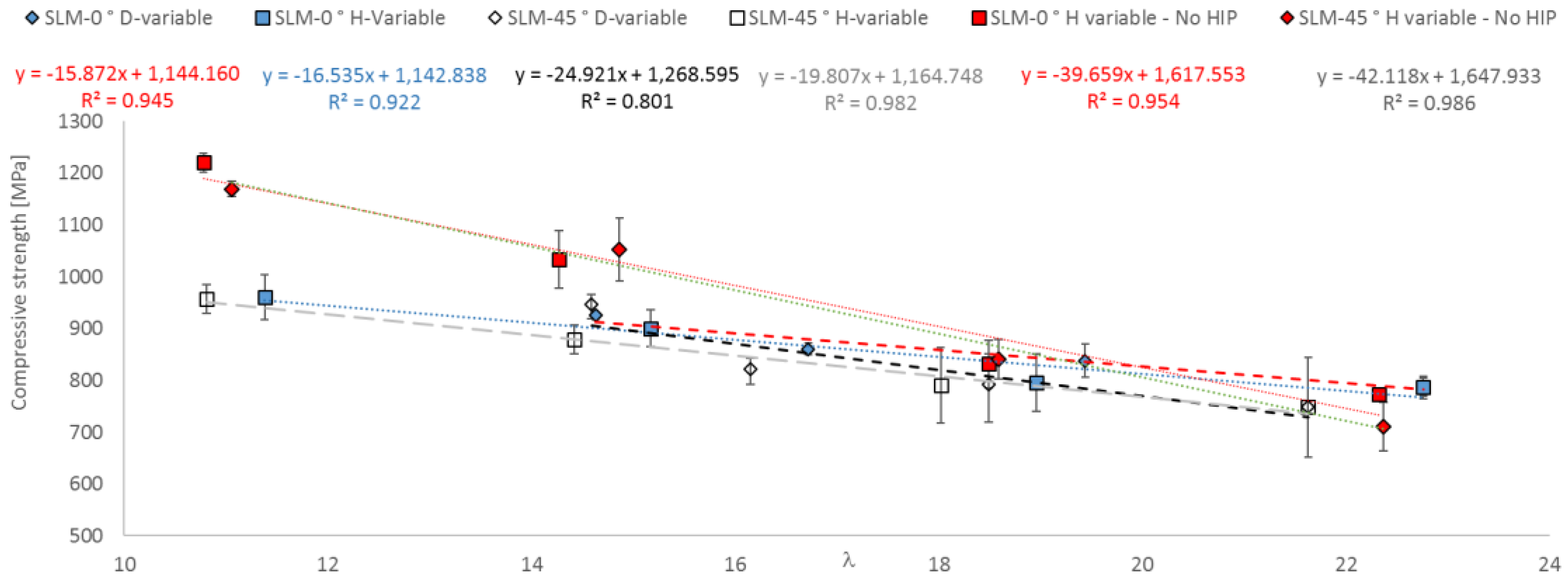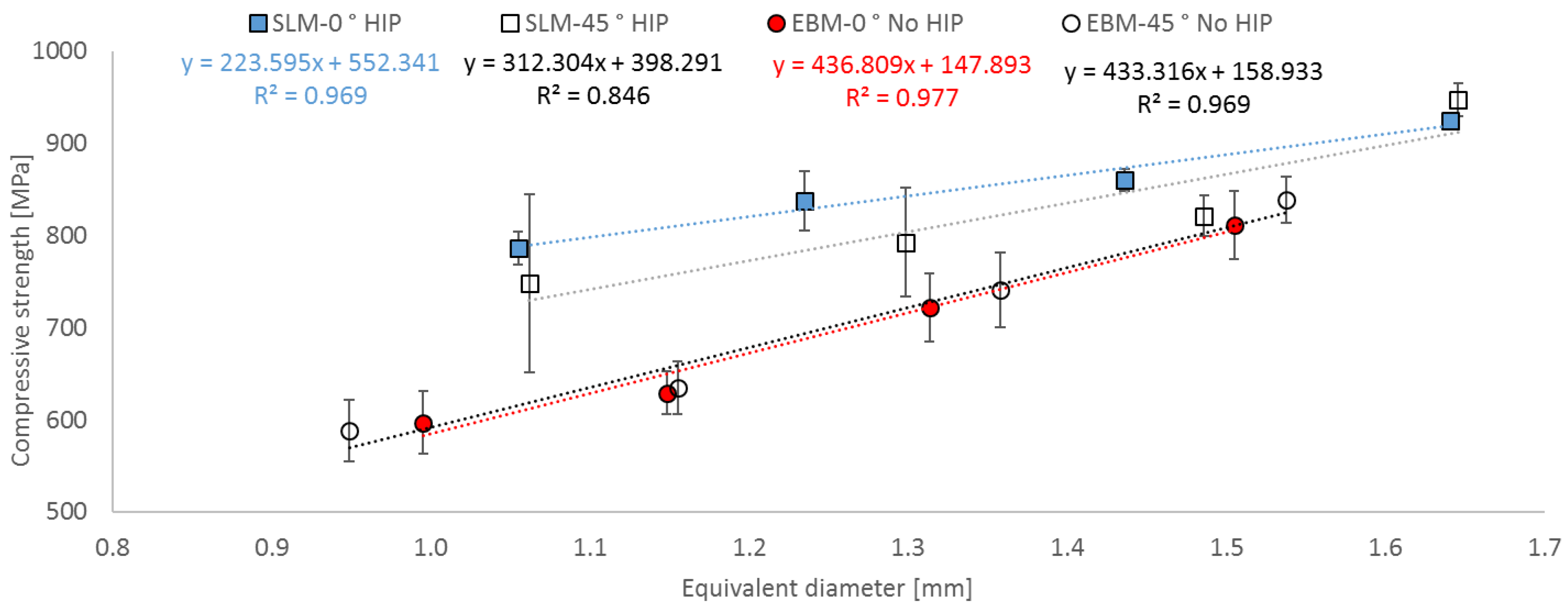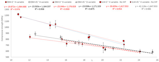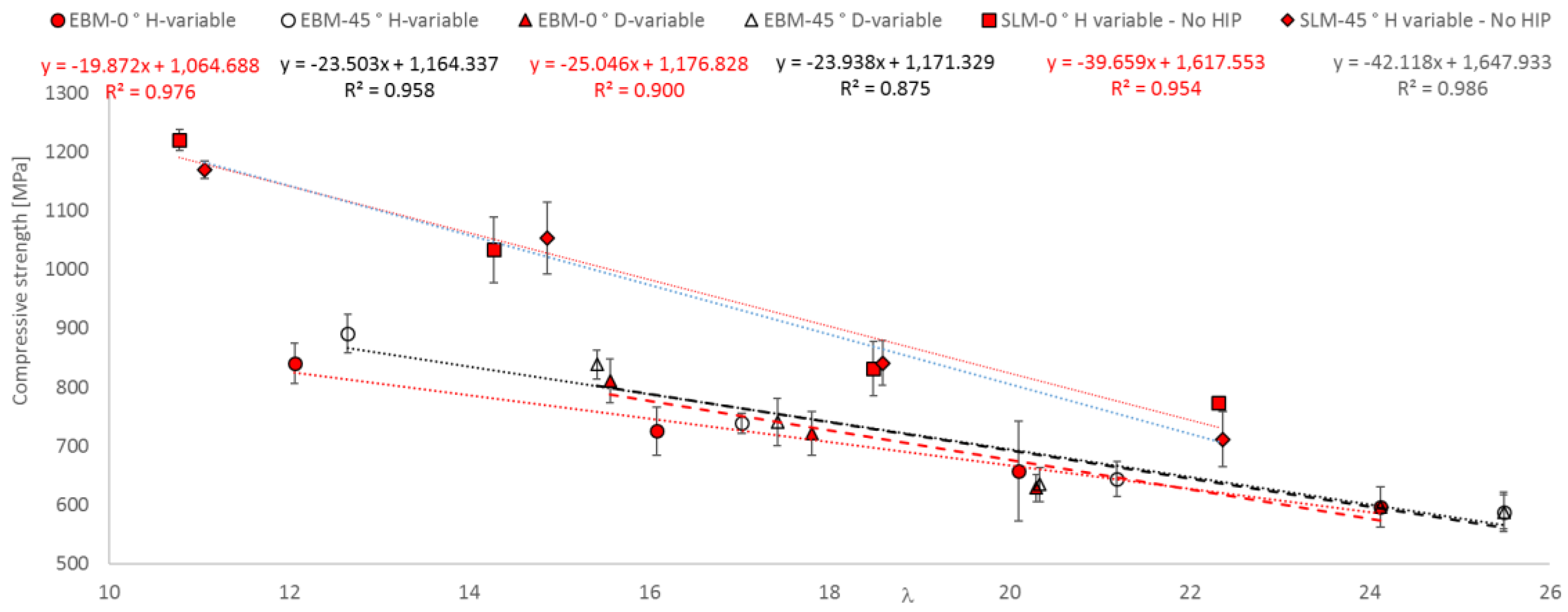 - A functional correlation between compressive strength and slenderness ratio (λ) as well as between equivalent diameter (d) and height (L) of EBM and SLM parts could be established.