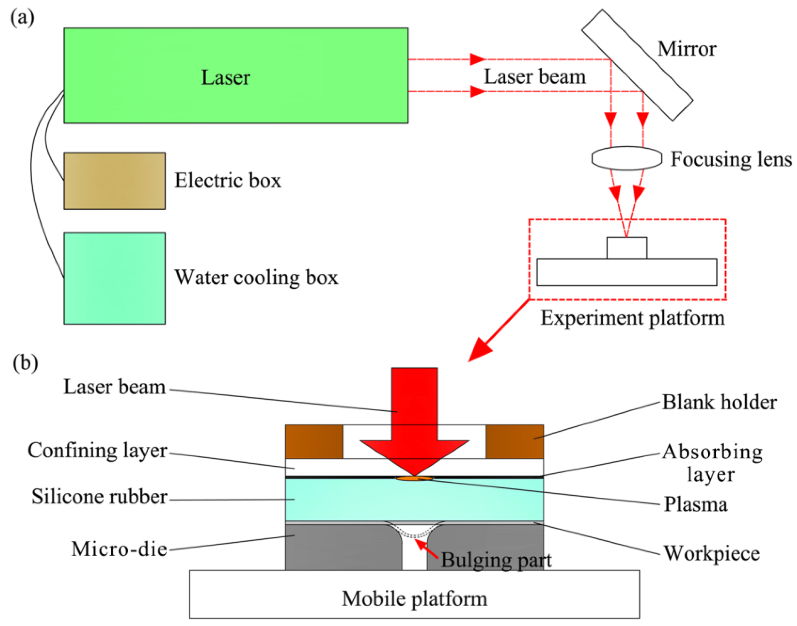 A forming system of LFSB includes a laser, control system, water cooling system, and experiment platform, as shown in Figure 1 [21]. The experiment platform is installed on the mobile platform. The experiment platform from top to bottom is a blank holder, confining layer, absorbing layer, silicone rubber, workpiece, and micro-die. When the laser penetrates the confining layer and irradiates on the absorbing layer, laser energy is absorbed and vaporizes instantaneously into high temperature and high pressure plasma. The plasma continues to absorb laser energy, which generates a shock wave. When the shock wave acts on the silicone rubber, it propagates inside in the form of stress waves. This could generate a pressure enhancement effect due to the fact that the wave impedance of silicone rubber is less than the wave impedance of the workpiece, which is the principle of impedance matching failure [22]. Finally, the elastic deformation of the silicone rubber leads to the plastic deformation of the workpiece.