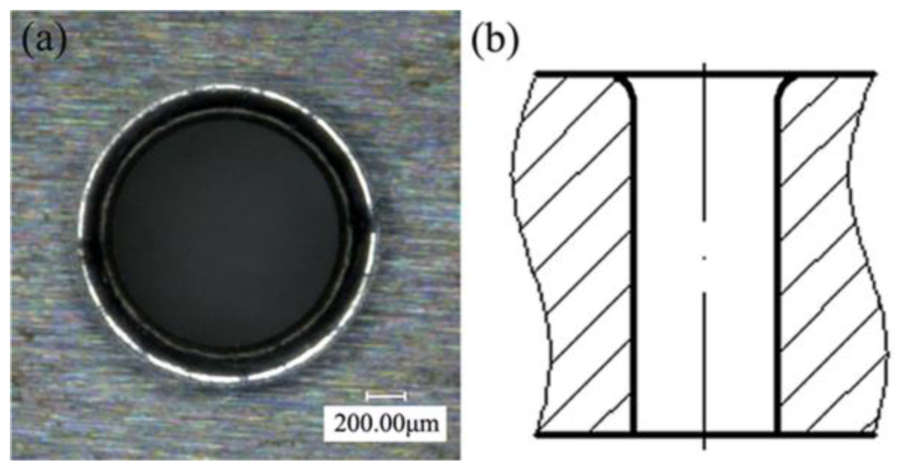In order to reduce the effect of air resistance on the LFSB, the micro-bulging die was designed by a through-hole, as shown in Figure 2. In addition, the micro-die surface should have a certain hardness in the LFSB. Thus, 1095 die steel was selected as the die material. The surface hardness of 1095 die steel can reach HRC60 (Rockwell hardness) after heat treatment. The micro-die was fabricated by the wire cutting technique and measured through digital microscopy (KEYENCE VHX-1000C, KEYENCE Corporation, Osaka, Japan). The design dimensions and actual dimensions of the micro-die are shown in Table 1. It can be seen from the table that the dimension error was very small, so the micro-die met the experimental requirements.
