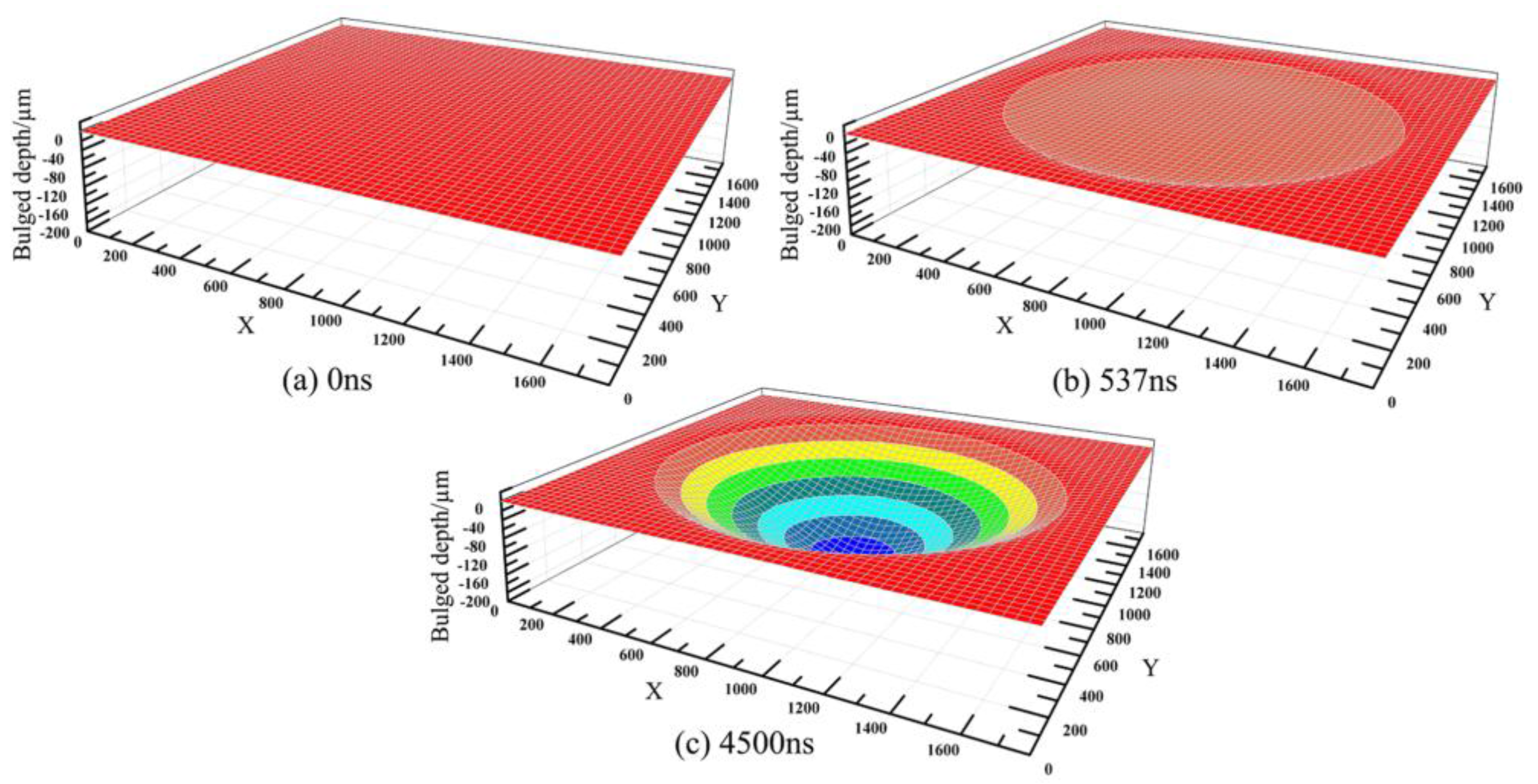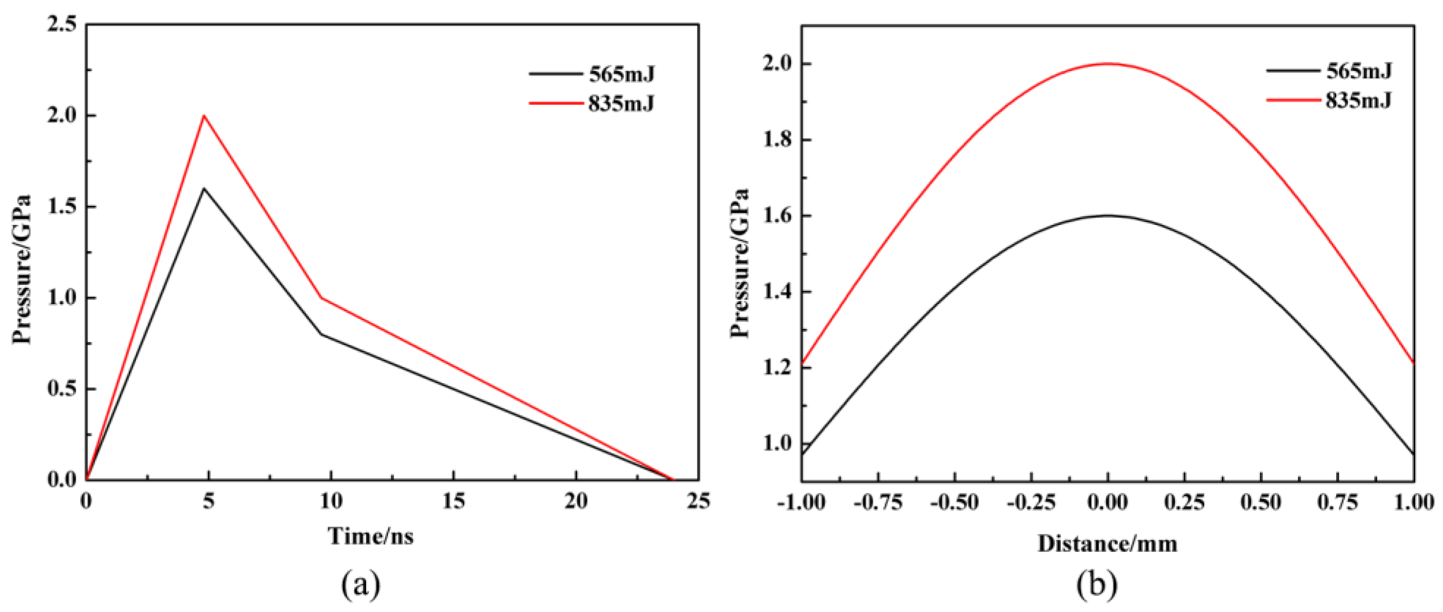 In Section 3.3, the peak pressure of the shock wave corresponding to 565 mJ and 835 mJ was calculated as 1.6 Gpa and 2.0 GPa, respectively. The action time of the shock wave pressure was about 2–3 times the laser pulse width under the constraint condition [28]. According to the Fabbro model simplified by Zhou [29], the temporal distribution and the spatial distribution of the shock wave pressure are shown in Figure 3. The shock wave pressure was applied on the upper surface of the silicone rubber. The loading area was the area of laser beam irradiation (d = 2 mm).