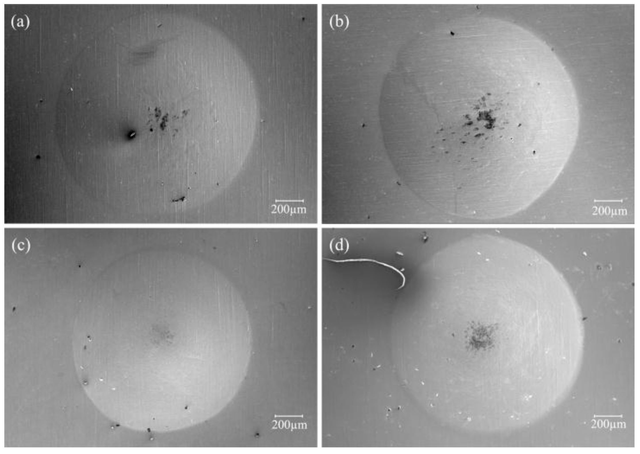 The bottom surface feature of the micro bulging parts under different conditions: (a) 60 µm, 565 mJ (b) 60 µm, 835 mJ (c) 40 µm, 565 mJ (d) 40 µm, 835 mJ.