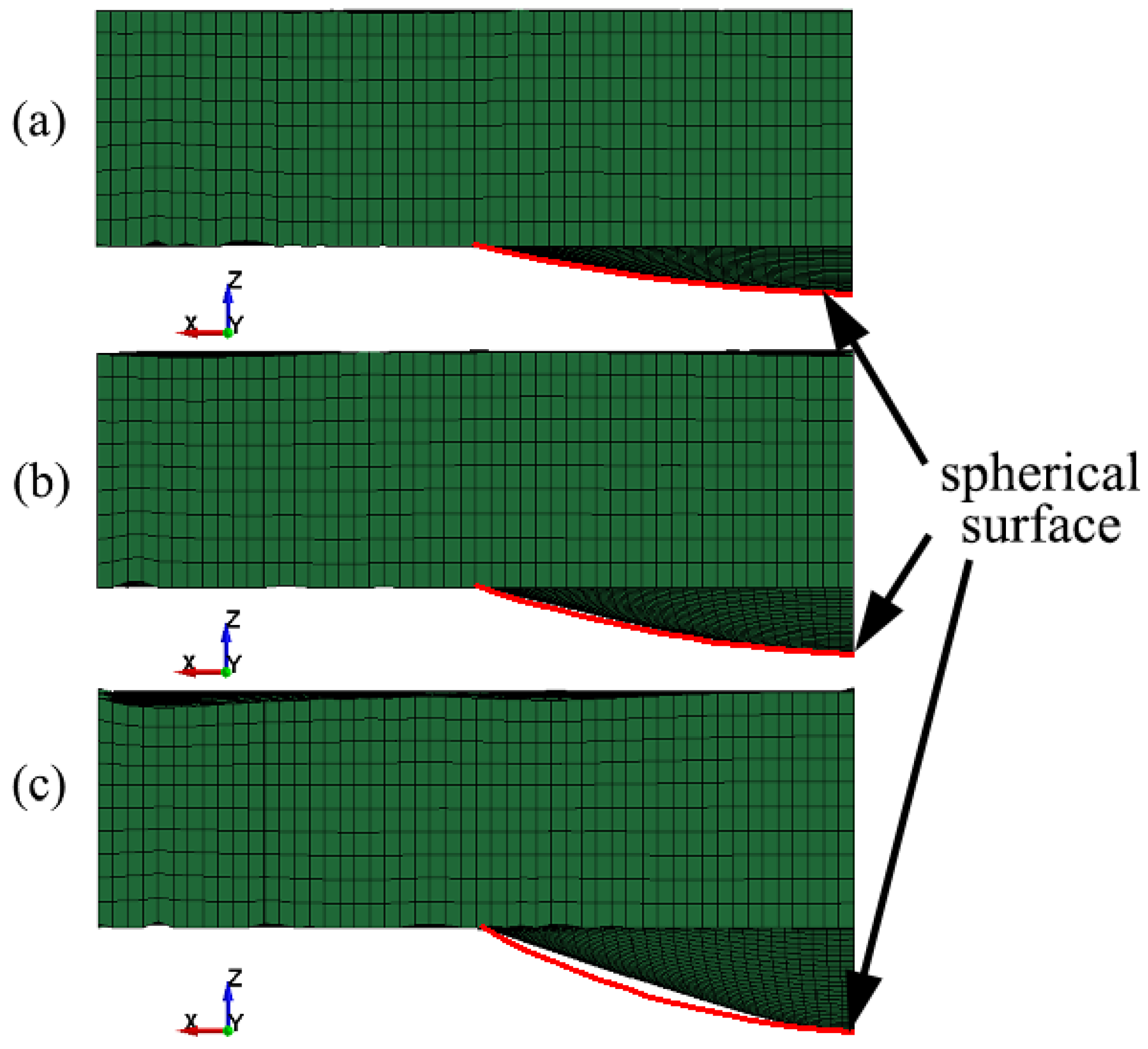 Deformation shape of silicone rubber under different conditions in the numerical simulation: (a) 80 µm, 565 mJ (b) 60 µm, 565 mJ (c) 40 µm, 565 mJ.