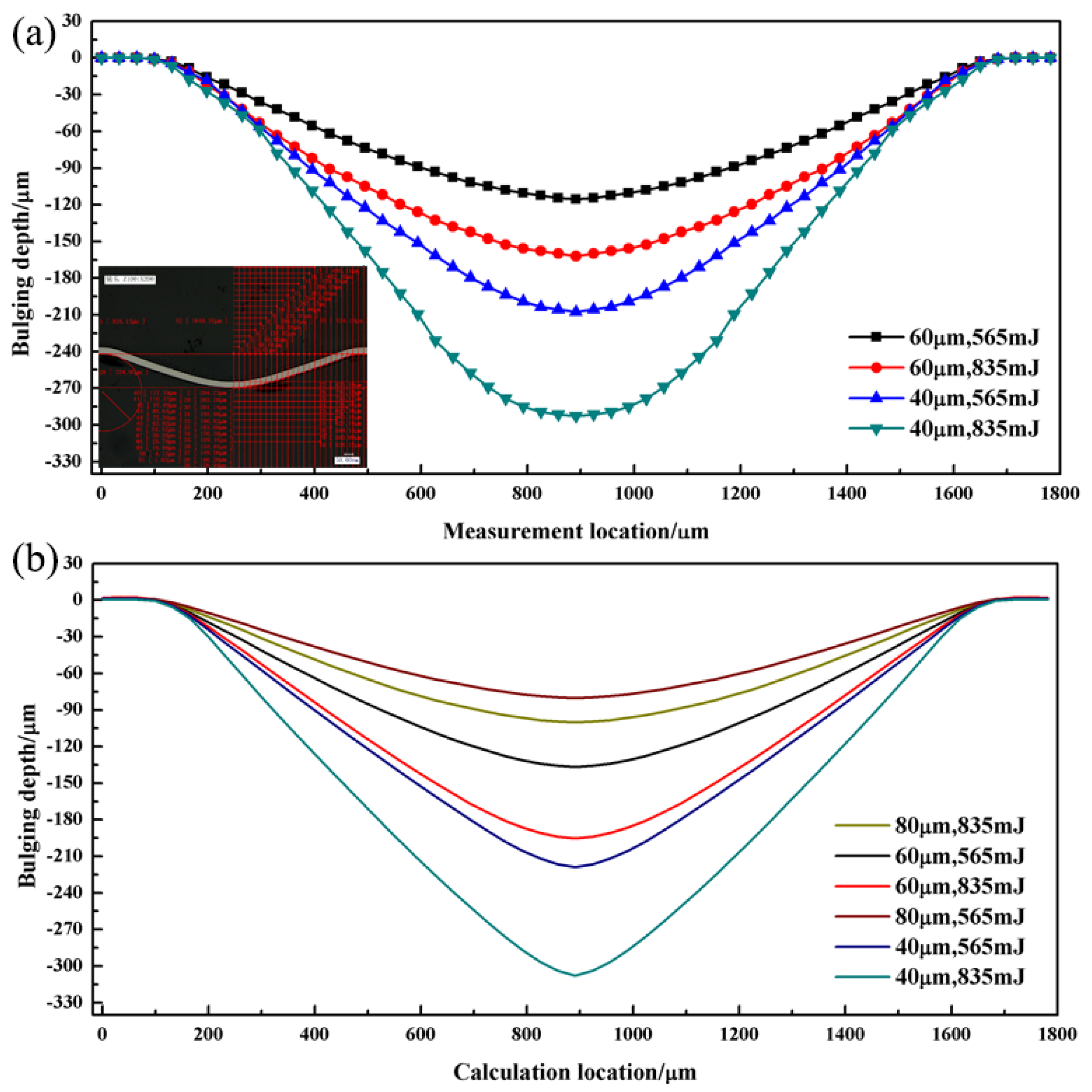 In order to reveal the influence of workpiece thickness and laser energy on the depth of the micro bulging parts, these were mounted by low viscosity epoxy, grinded by 180# to 2000# sand papers, and polished by a polishing machine. Finally, the cross section of the micro bulging parts was obtained. The cross section was measured by a digital microscope, as shown in Figure 8a. According to Figure 5 and Figure 8a, it was found that the depth of the micro bulging parts increased with an increase of the laser energy under the same workpiece thickness; under the same laser energy, the depth of the micro bulging parts also increased with a decrease of workpiece thickness. This phenomenon can be explained by the surface layer model for the polycrystalline material [31]. Figure 8 shows the numerical simulation results about the depth of the micro bulging parts under different conditions. The trend of the numerical simulation results was consistent with the experiments. However, the numerical simulation results were larger compared with the experimental results. The deviation of the bulging depth reached about 20% for the thicker samples and 5% for the thinner samples between the experiments and simulation. Part of the reason for this might be a certain air resistance in the experiment.