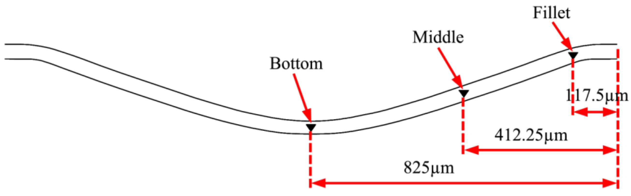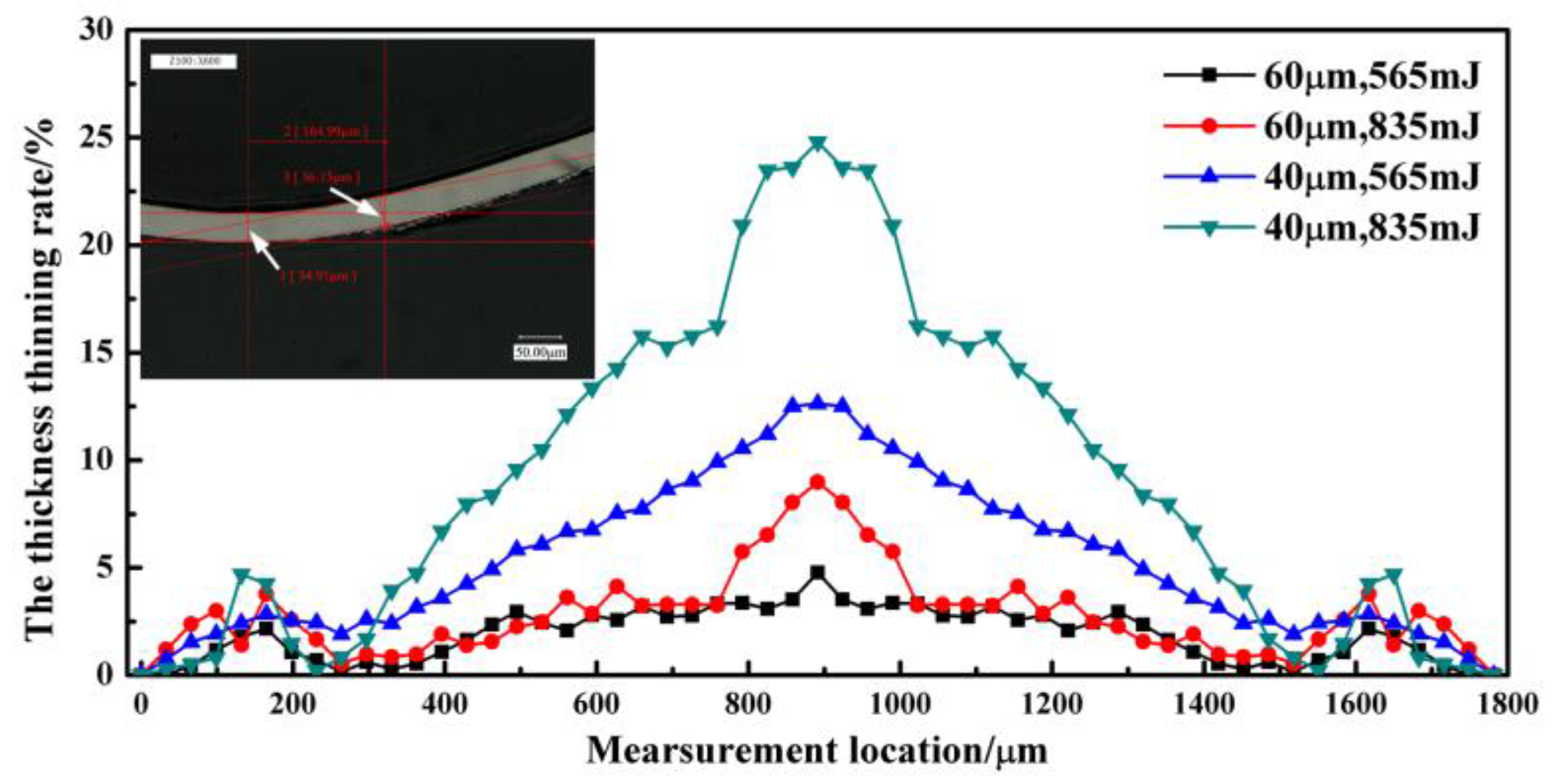 Based on the obtained cross section of the micro bulging parts, the thickness distribution was analyzed quantitatively by measuring the thickness of the cross section, as shown in Figure 9. The thickness thinning rate T is defined as follows: