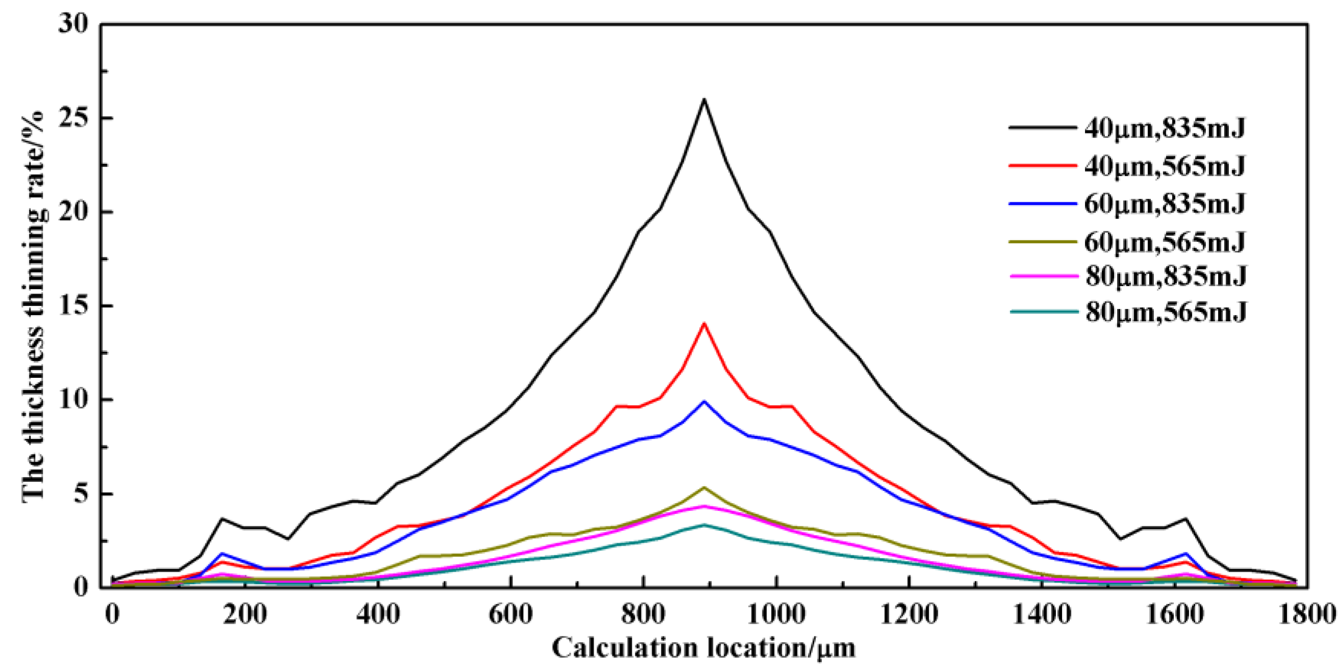 It was found from Figure 9 that the thickness thinning rate of the micro bulging parts gradually increased with a decrease of workpiece thickness and an increase of laser energy. This result was consistent with that shown by the bulging depth. The workpiece generated larger plastic deformation with an increase of laser energy under the same thickness, so that thickness thinning of the workpiece increased. According to the surface layer model, the flow stress of the material decreased with a decrease of the thickness. Thus, the plastic deformation of the thinner workpiece was larger at the same laser energy. In addition, the thinning rate increased significantly with an increase of laser energy from 565 mJ to 835 mJ for the 304 stainless steel foil with 40 µm thickness. For the maximum thinning rate, the value for the workpiece with 40 µm thickness was 12.6% and 24.8%, while for the workpiece with 60 µm thickness was 4.8% and 8.9%, for the laser energies of 565 mJ and 835 mJ, respectively. These results indicated that the thinner workpiece generated a larger deformation under a larger laser energy. Figure 11 shows the thickness thinning rate distribution of the micro bulging parts in the numerical simulation. Although the maximum thinning rate in the simulation was larger than that in the experiment—the deviation of the thickness thinning rate reaches about 12% for the thicker samples and 10% for the thinner samples between the experiments and simulation—the trend of the simulation results was in agreement with the experimental results.