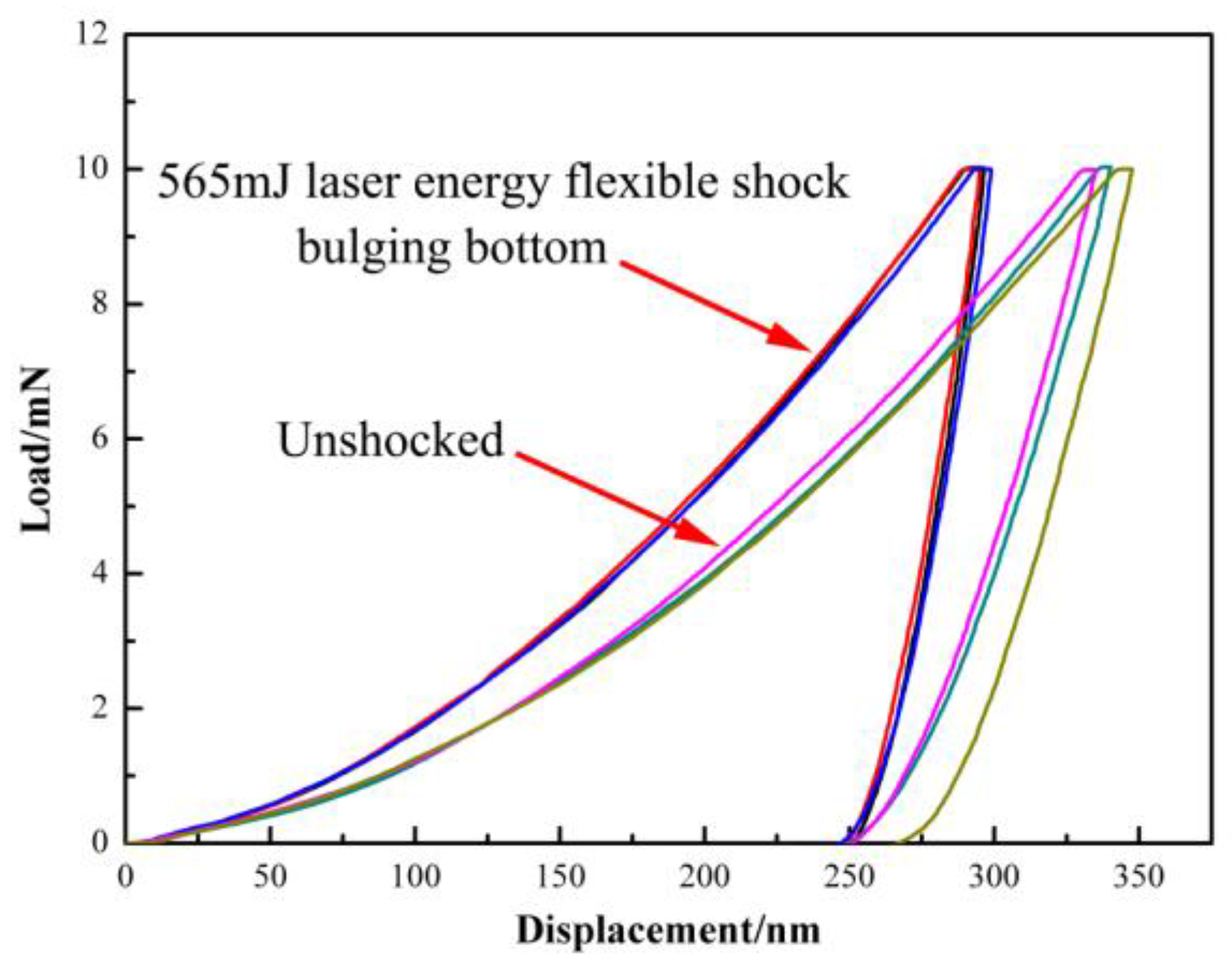 Nanoindentation test technology has been widely used to characterize the micro scale mechanical properties of the materials, including nanohardness and elastic modulus. A NanoIndenter CSM with a Berkovich diamond indenter was used to test the hardness in the cross sections of the micro bulging parts in this paper. The location of the nanoindentation test points is shown in Figure 12. It included the bottom, middle, and fillet of the cross section, and the measuring position was in the middle of the corresponding thickness. The maximum load was set to 10 mN, and the holding time was 5 s in the measurement process. Figure 13 shows the nanoindentation load-displacement curve of the 304 stainless steel foil with 40 µm thickness before and after laser flexible shock.