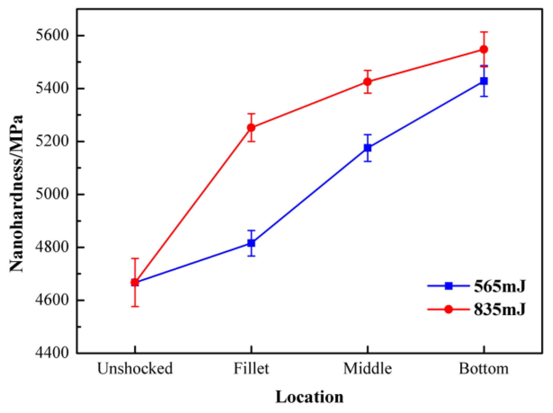 - The grains were refined and the nano-hardness of the workpiece in the cross section increased obviously after the laser flexible shock effect.
