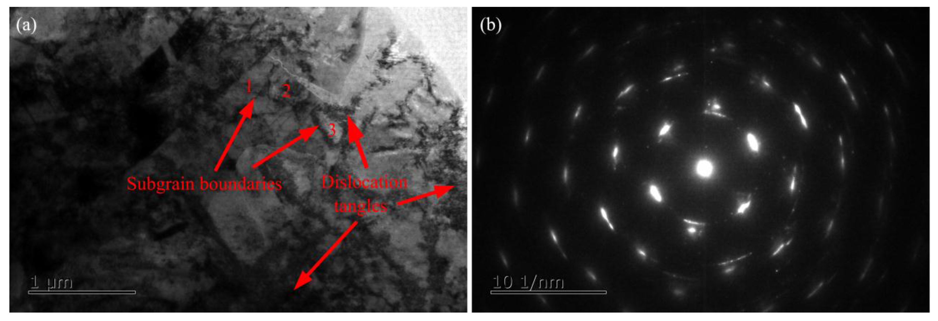 (a) TEM image showing subgrains of the bottom area after laser flexible shock; (b) the electron diffraction of the corresponding selected area.