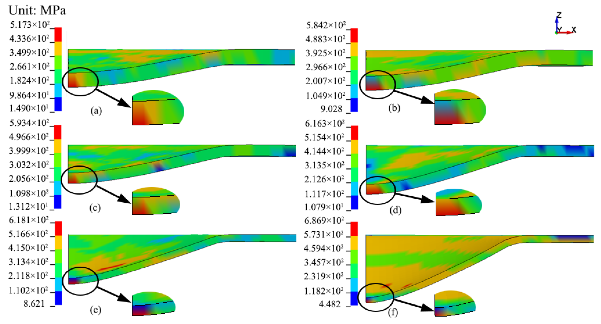 The equivalent stress distribution of micro bulging parts under different conditions: (a) 80 µm, 565 mJ (b) 80 µm, 835 mJ (c) 60 µm, 565 mJ (d) 60 µm, 835 mJ (e) 40 µm, 565 mJ (f) 40 µm, 835 mJ.