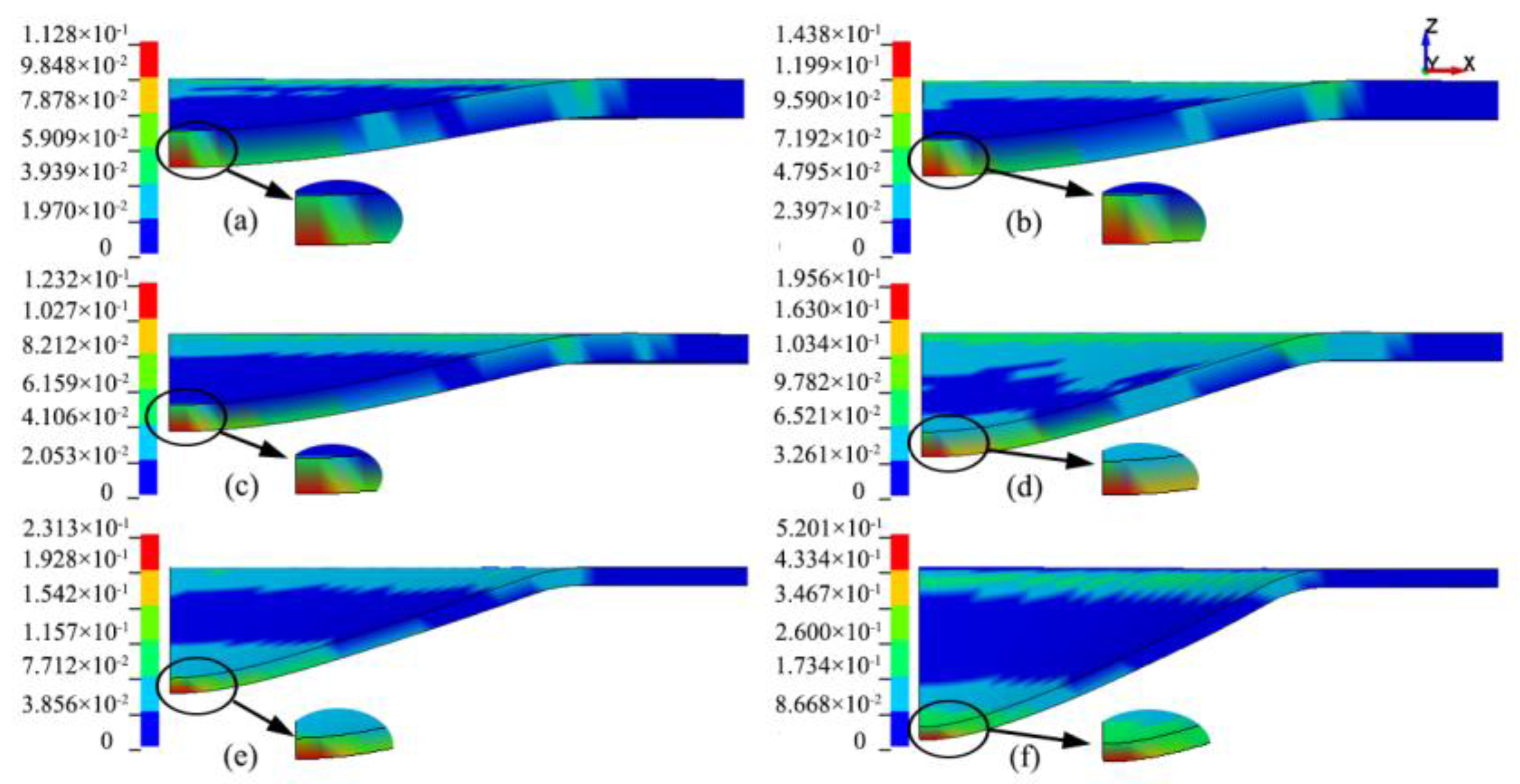 The equivalent plastic strain distribution of the micro bulging parts under different conditions: (a) 80 µm, 565 mJ (b) 80 µm, 835 mJ (c) 60 µm, 565 mJ (d) 60 µm, 835 mJ (e) 40 µm, 565 mJ (f) 40 µm, 835 mJ.