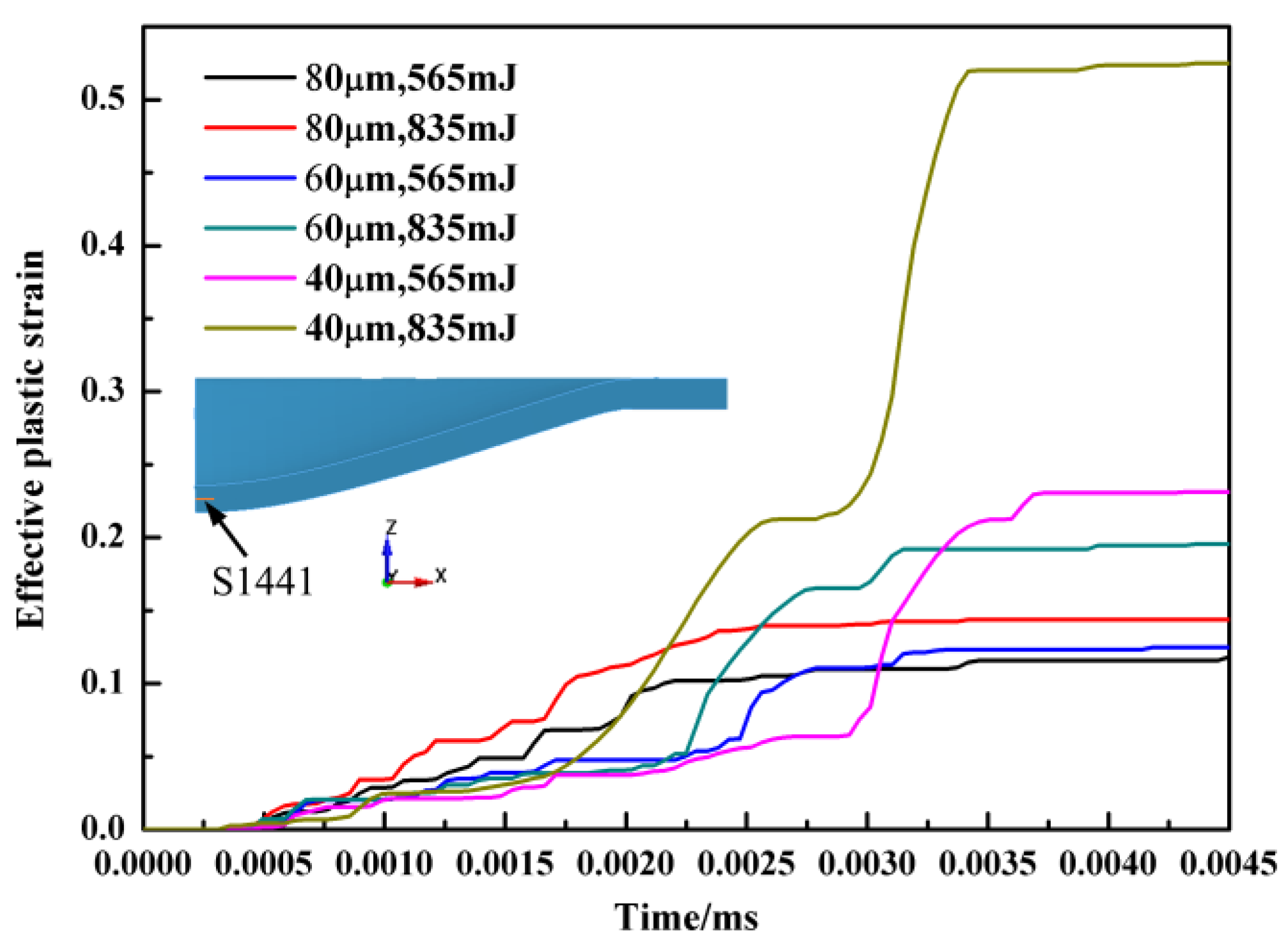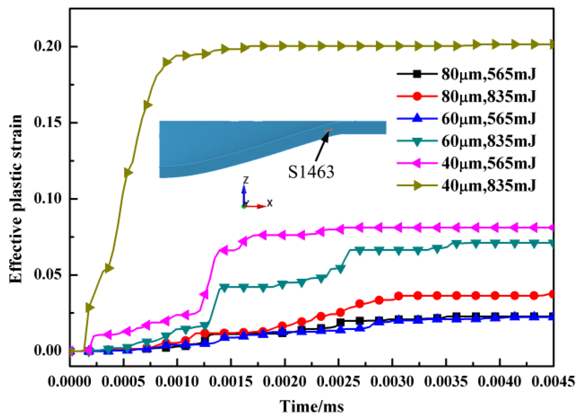 Figure 17 shows the equivalent plastic strain distribution of the micro bulging parts under different conditions. From the deformation process of micro-bulging (Figure 10), the plastic deformation of the workpiece occurred first at the mold fillet. The maximum equivalent plastic strain was at the bottom lower surface of the micro bulging parts with the continuous elastic deformation of silicone rubber. It can be seen clearly from Figure 17 that the maximum equivalent plastic strain increased from 0.12 to 0.52 with a decrease of the workpiece thickness from 80 µm to 40 µm and an increase of the laser energy from 565 mJ to 835 mJ. The simulated results indicated that the relative deformation of the bottom was larger with a decrease of the workpiece thickness and an increase of the laser energy. The variation of the equivalent plastic strain at the bottom thickness middle element S1441 of the micro bulging parts is shown in Figure 18. The equivalent plastic strain of the element S1441 presented an increasing trend. It was found that the increase was relatively slow in the beginning, and subsequently increased rapidly, since the micro-die fillet material was squeezed by the silicone rubber in the starting phase. However, the material at the micro-die cavity center was not obviously squeezed by the silicone rubber due to the lack of rigid contact. With the continuous deformation of the silicone rubber, the material was stretched inside of the cavity, so that the equivalent plastic strain of the element S1441 increased insignificantly. The variation of the equivalent plastic strain in the fillet thickness middle element S1463 of the micro bulging parts is shown in Figure 19. Similarly, there was an increase for the equivalent plastic strain of element S1463. According to Figure 18 and Figure 19, it was clear that the variation of the equivalent plastic strain in elements S1441 and S1463 was relatively larger when the workpiece thickness was 40 µm and the laser energy was 835 mJ.